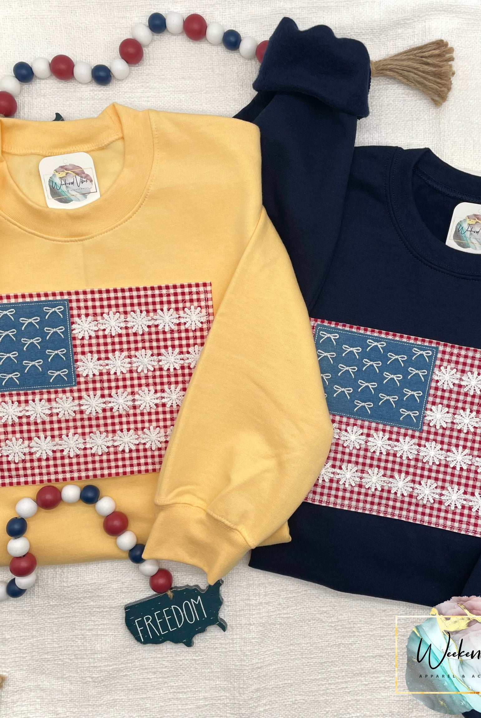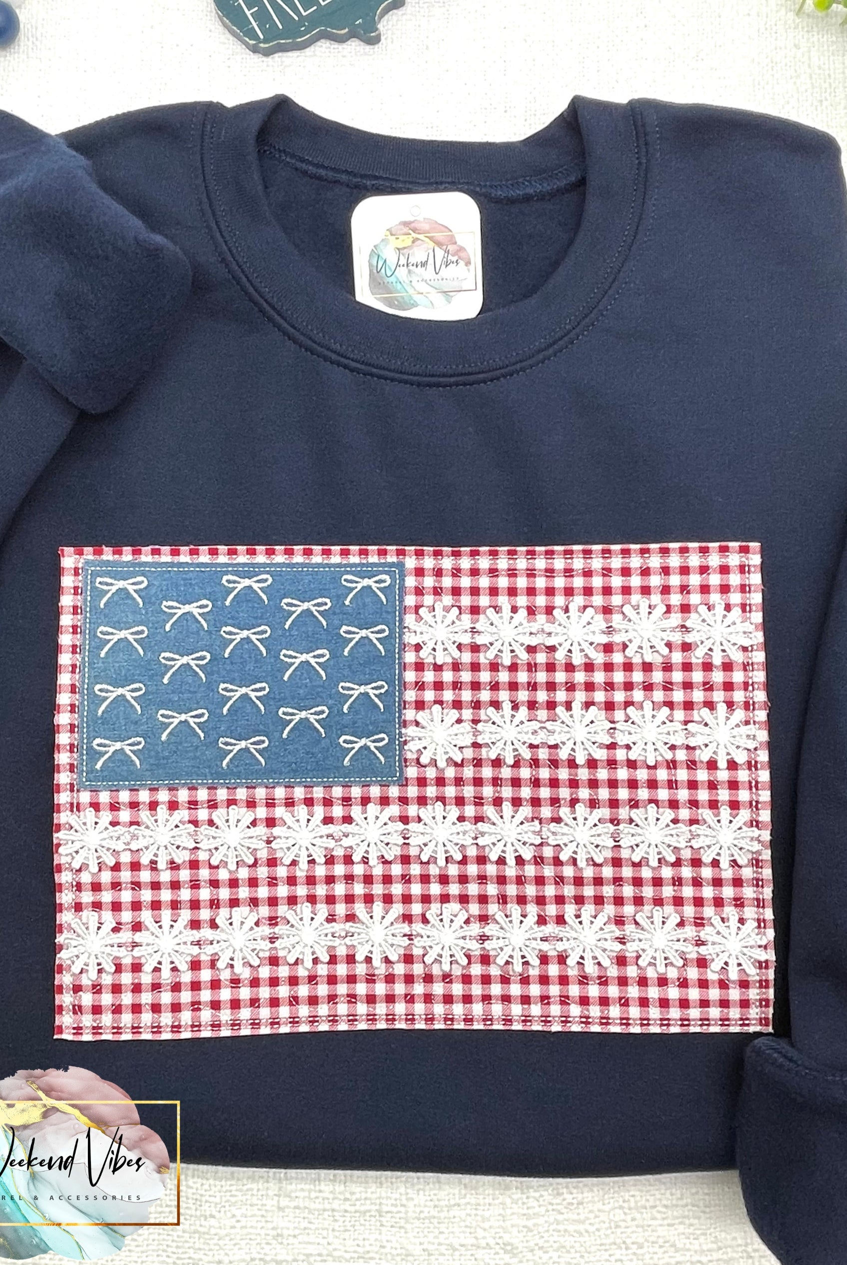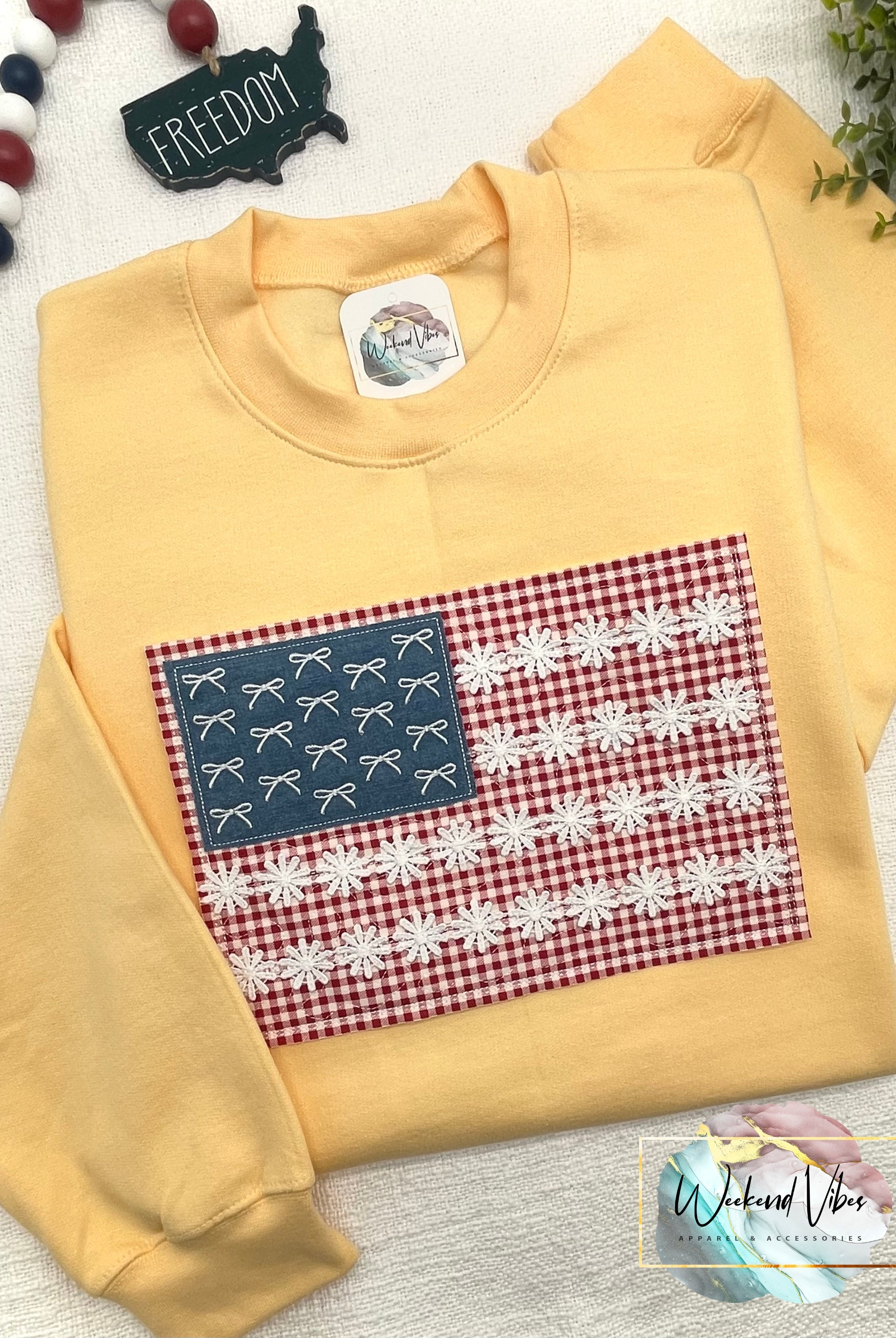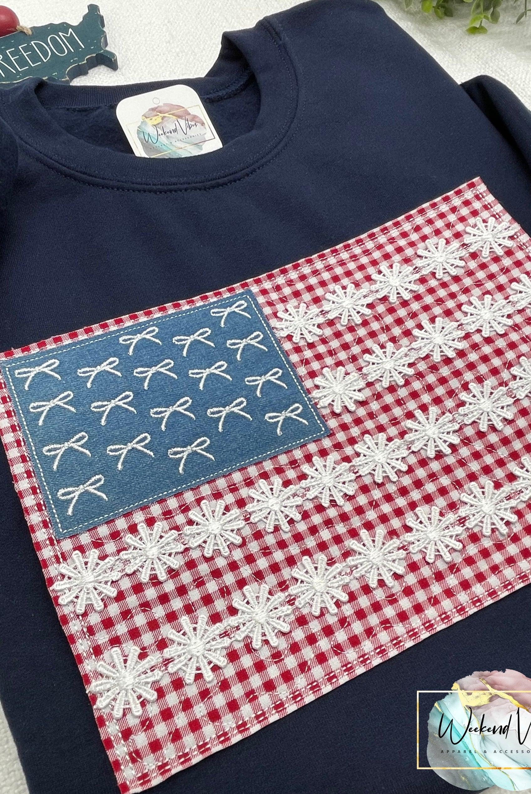 Embroidered Patriotic Flag Mini Bow Floral Sweatshirt, Vintage Inspired Americana Applique, Patriotic 4th of July Embroidery Top
