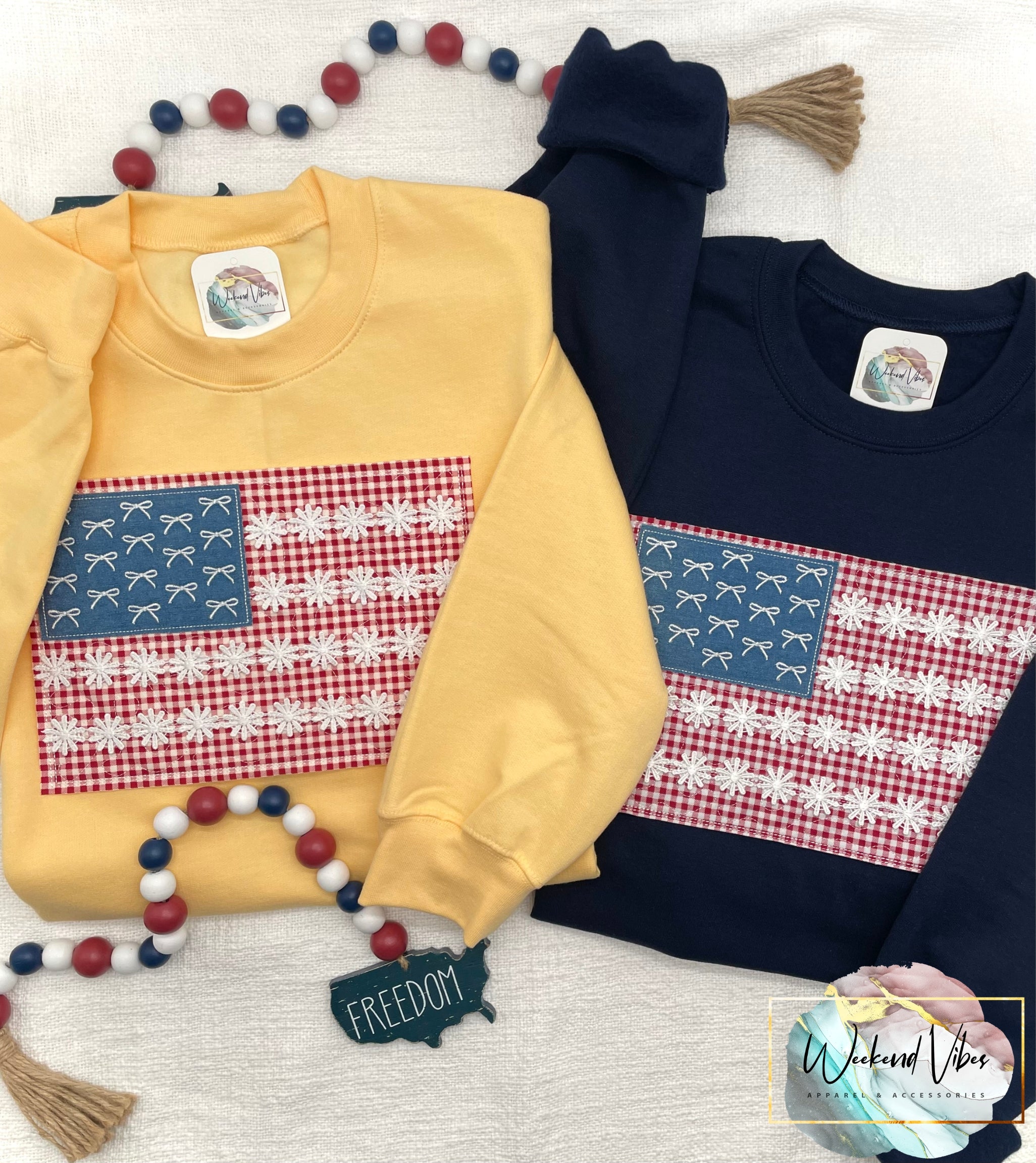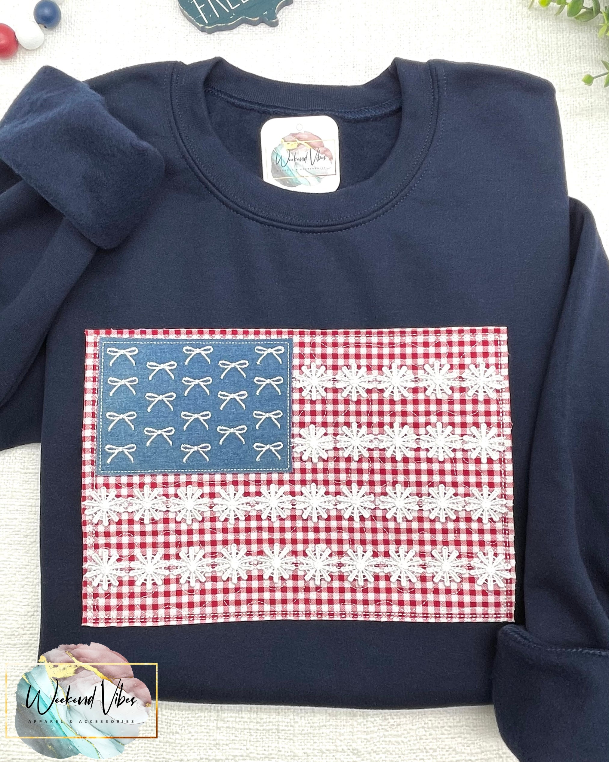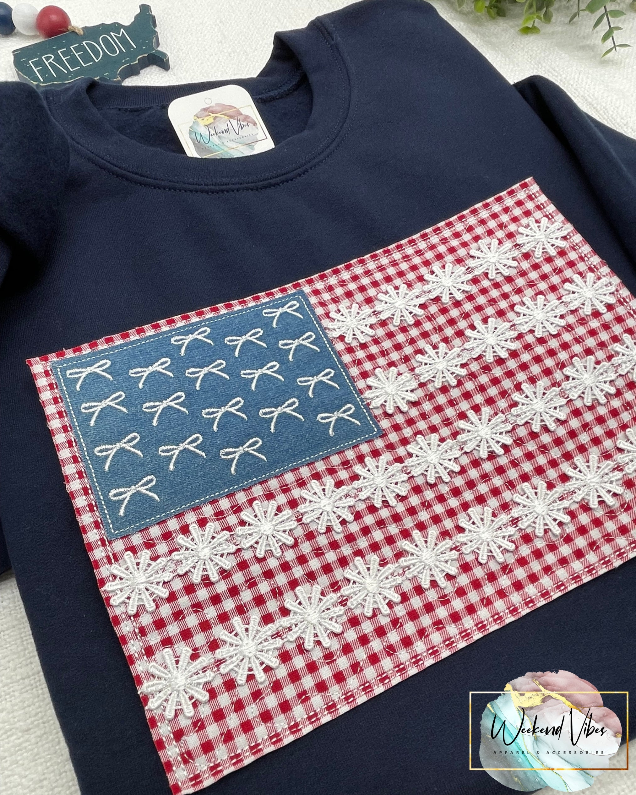 Embroidered Patriotic Flag Mini Bow Floral Sweatshirt, Vintage Inspired Americana Applique, Patriotic 4th of July Embroidery Top