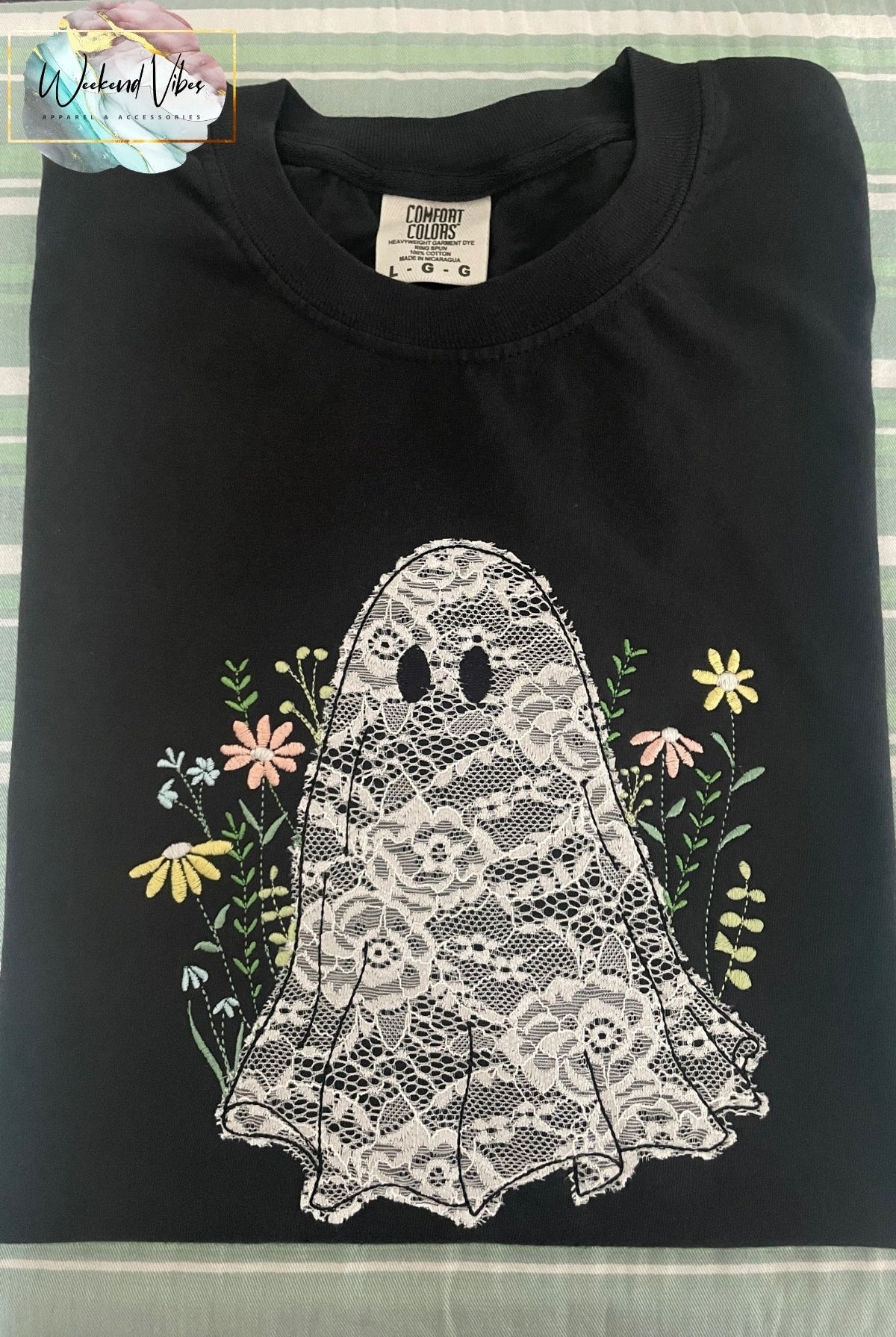 Embroidered Floral & Lace Ghost on Comfort Colors® T-shirt