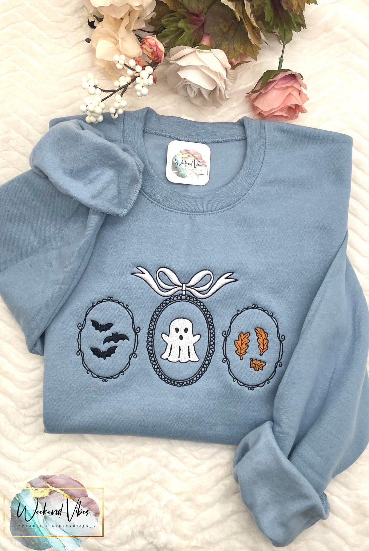 Embroidered Halloween Spook Frames Trio Sweatshirt, Fall Season Embroidery Sweatshirt