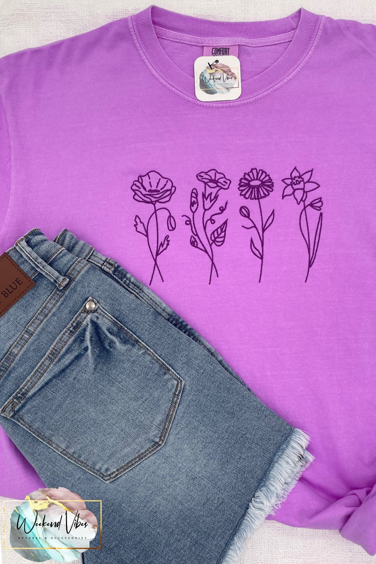Embroidered Birth Month Flowers on Comfort Colors Tee - Custom Embroidered Tee - Gift for Mom