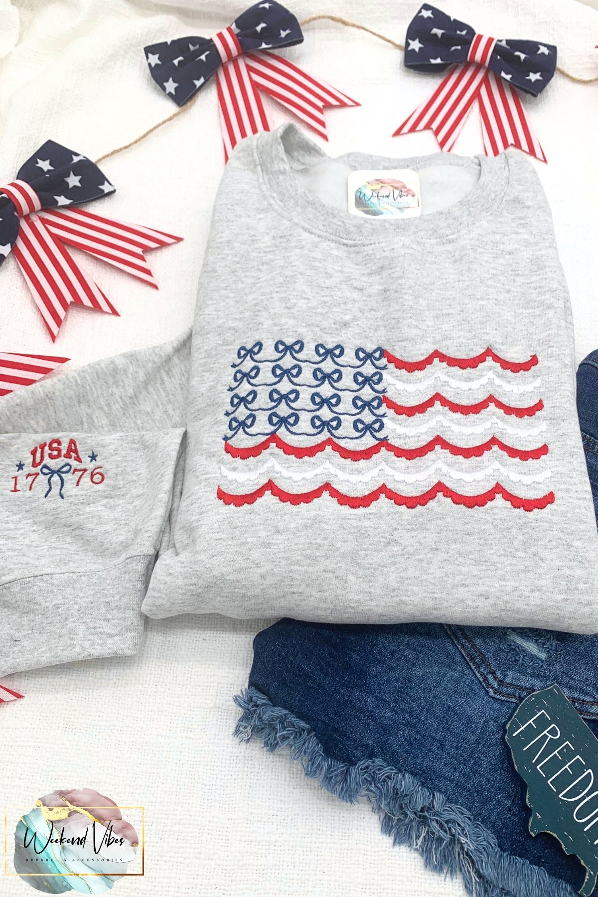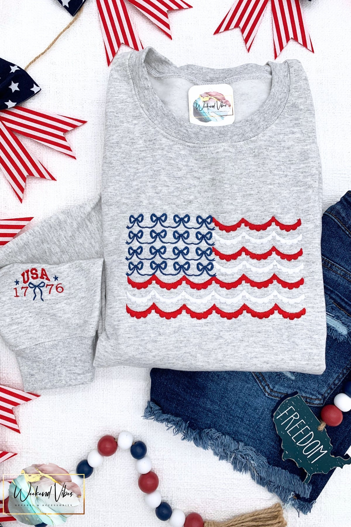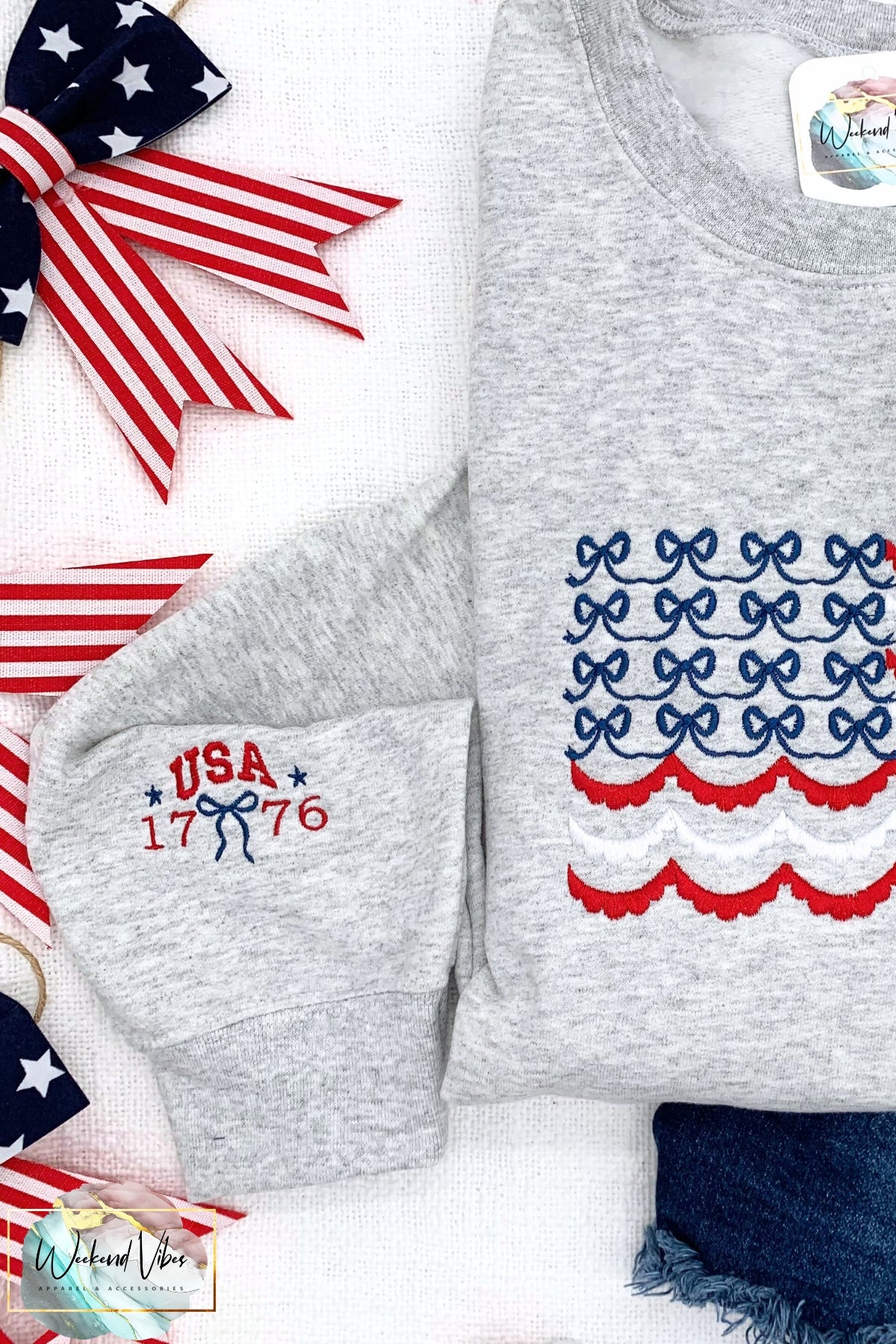 Our patriotic embroidered Red, White & Blue Bows Scallop Flag Sweatshirt is the perfect outer layer for year round festivities. You'll look fabulous watching the fireworks show in our cute & comfy USA Flag sweatshirt adorned with red & white scalloped stripes and navy blue bows. As a bonus detail, our patriotic sweatshirt also includes a sleeve design... red "USA 1776" with a navy blue bow & stars.
