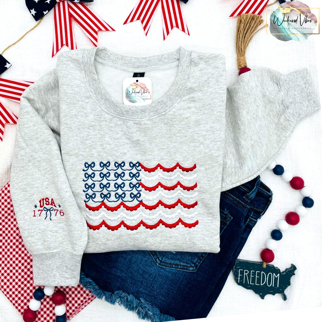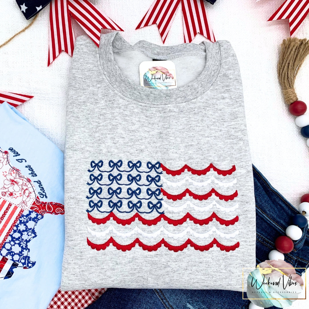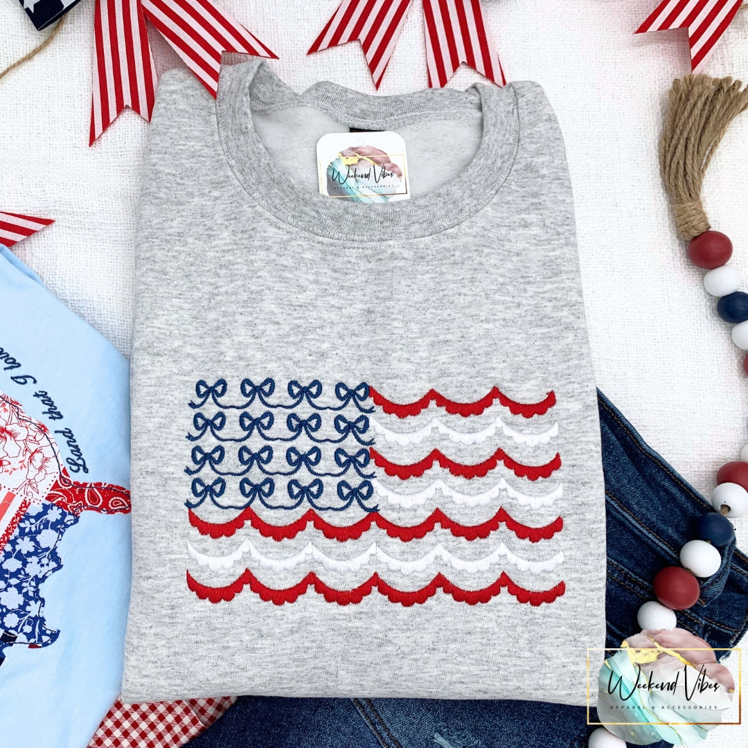 Embroidered Red White & Blue Bows Scallop Flag Sweatshirt