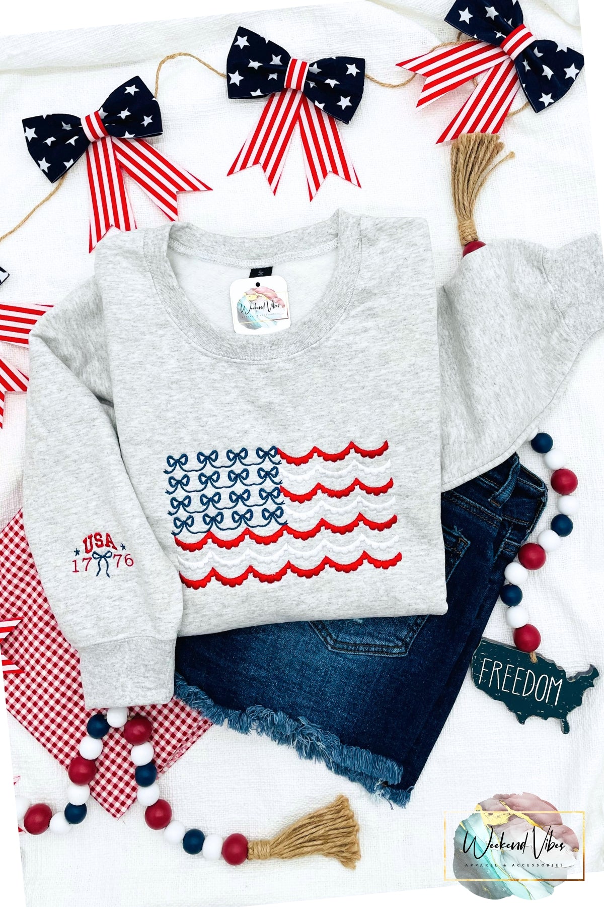 Keywords: Women's Patriotic Sweatshirt, 4th of July Sweatshirt, USA Flag Sweatshirt, Beach Nights Pullover, Weekend Vibes Style, weekendvibesapparel.