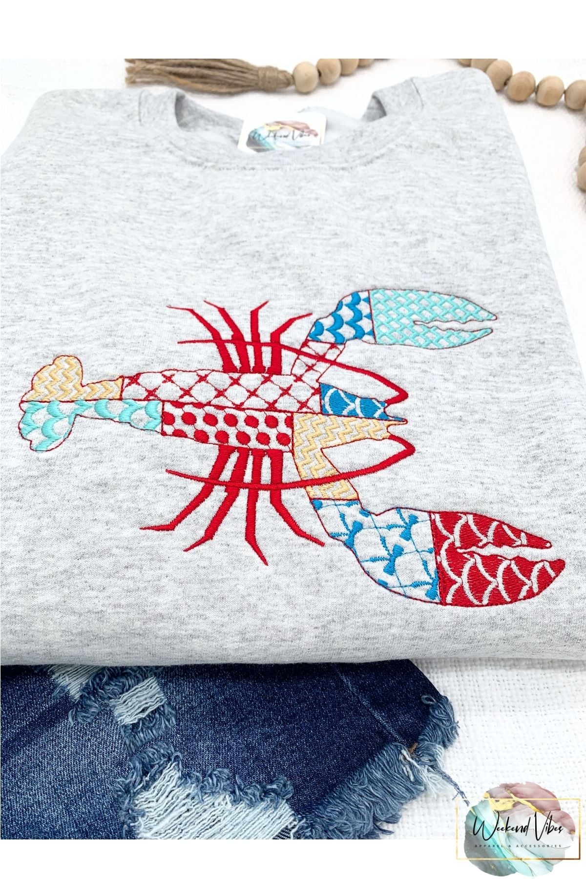Lobster Patchwork Patterned Embroidered Sweatshirt, Sea Life Embroidery, Summer Coastal Beach Vibes, Nautical Design, Ocean Lover Sweatshirt