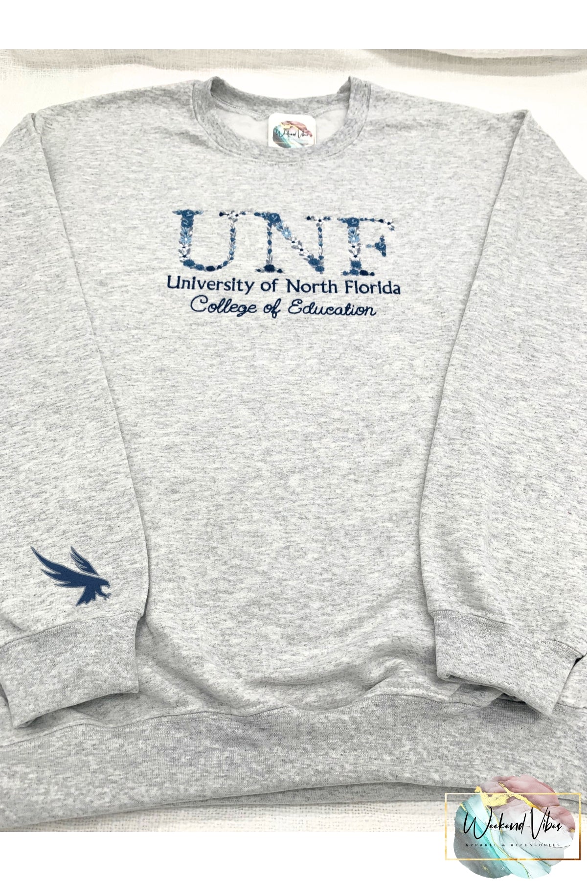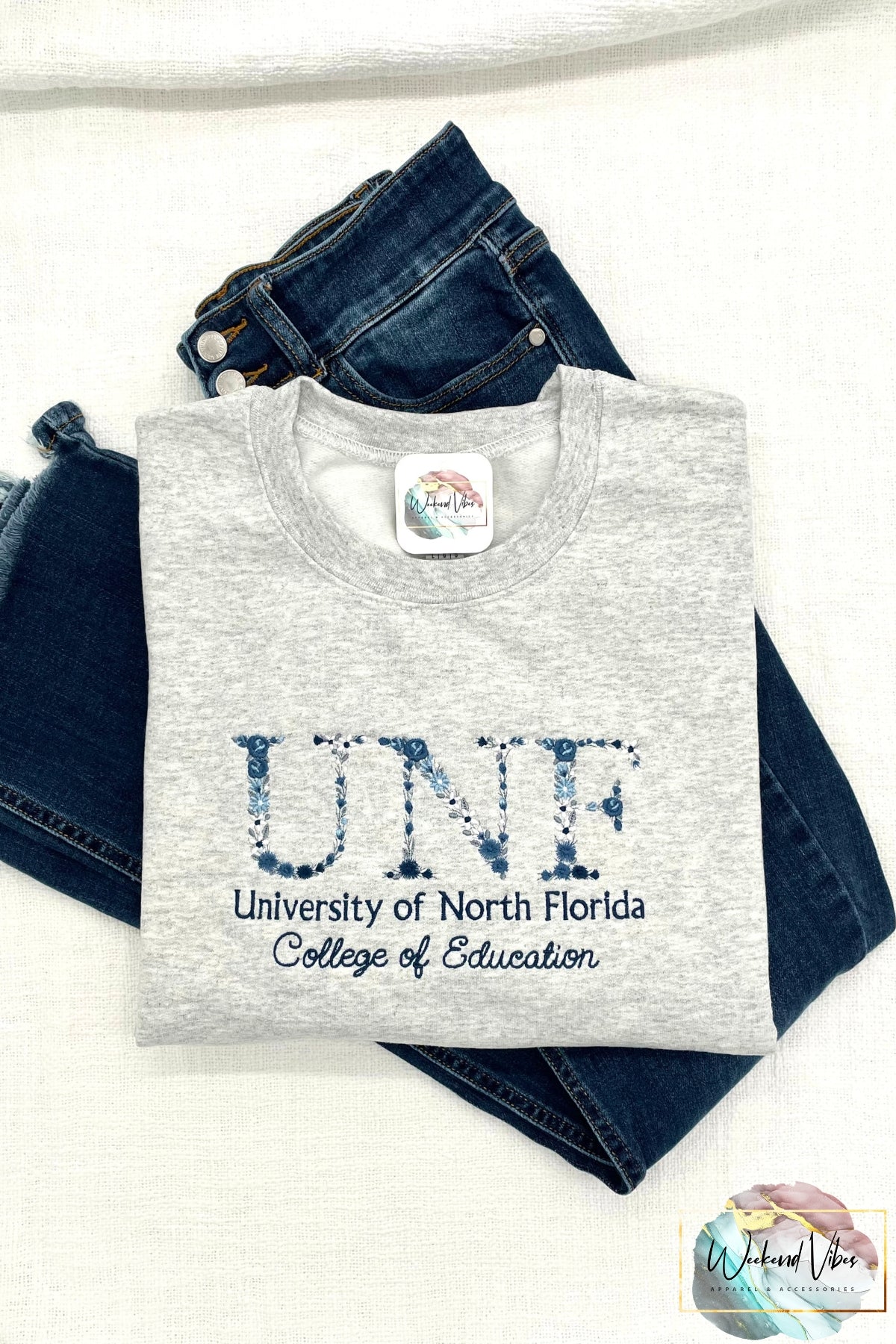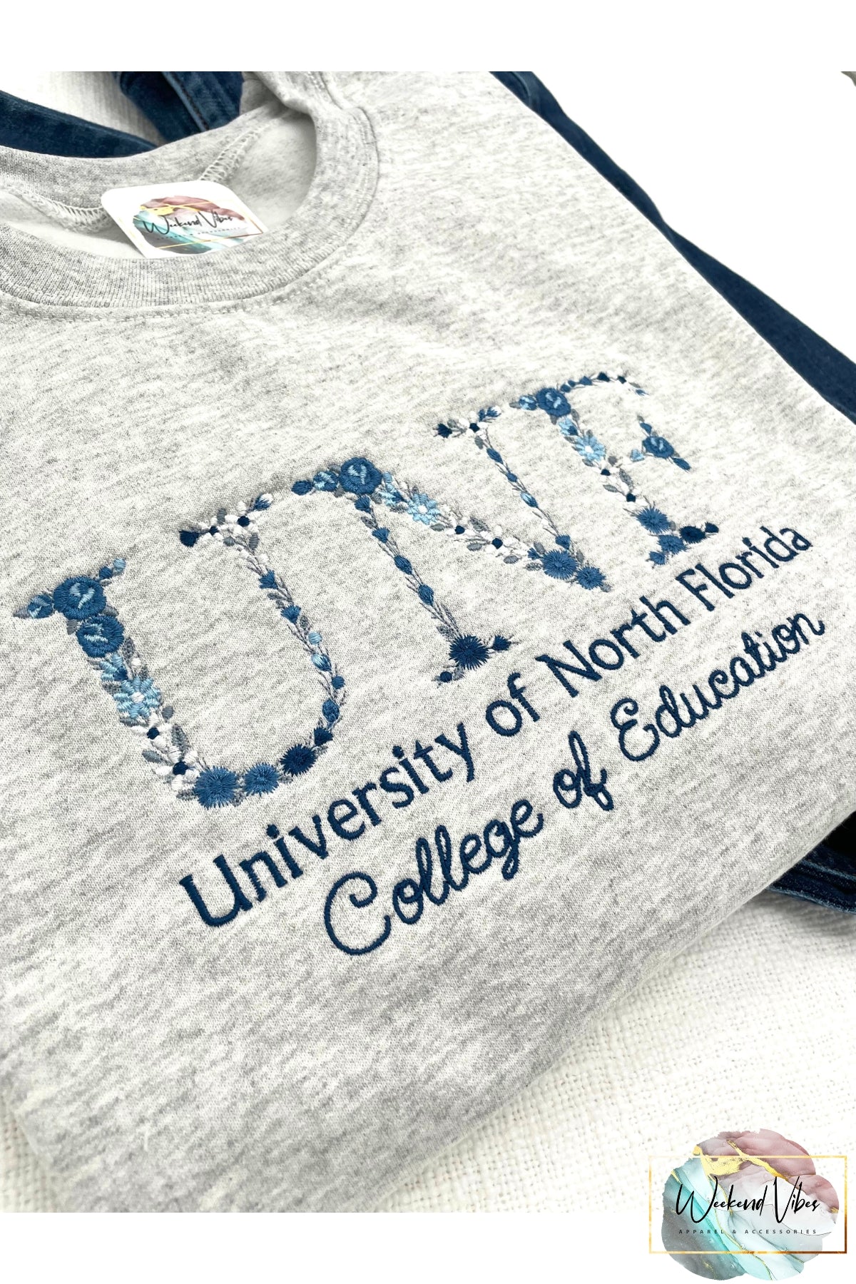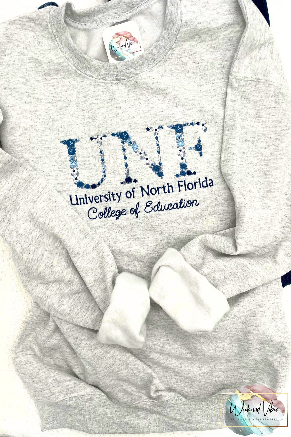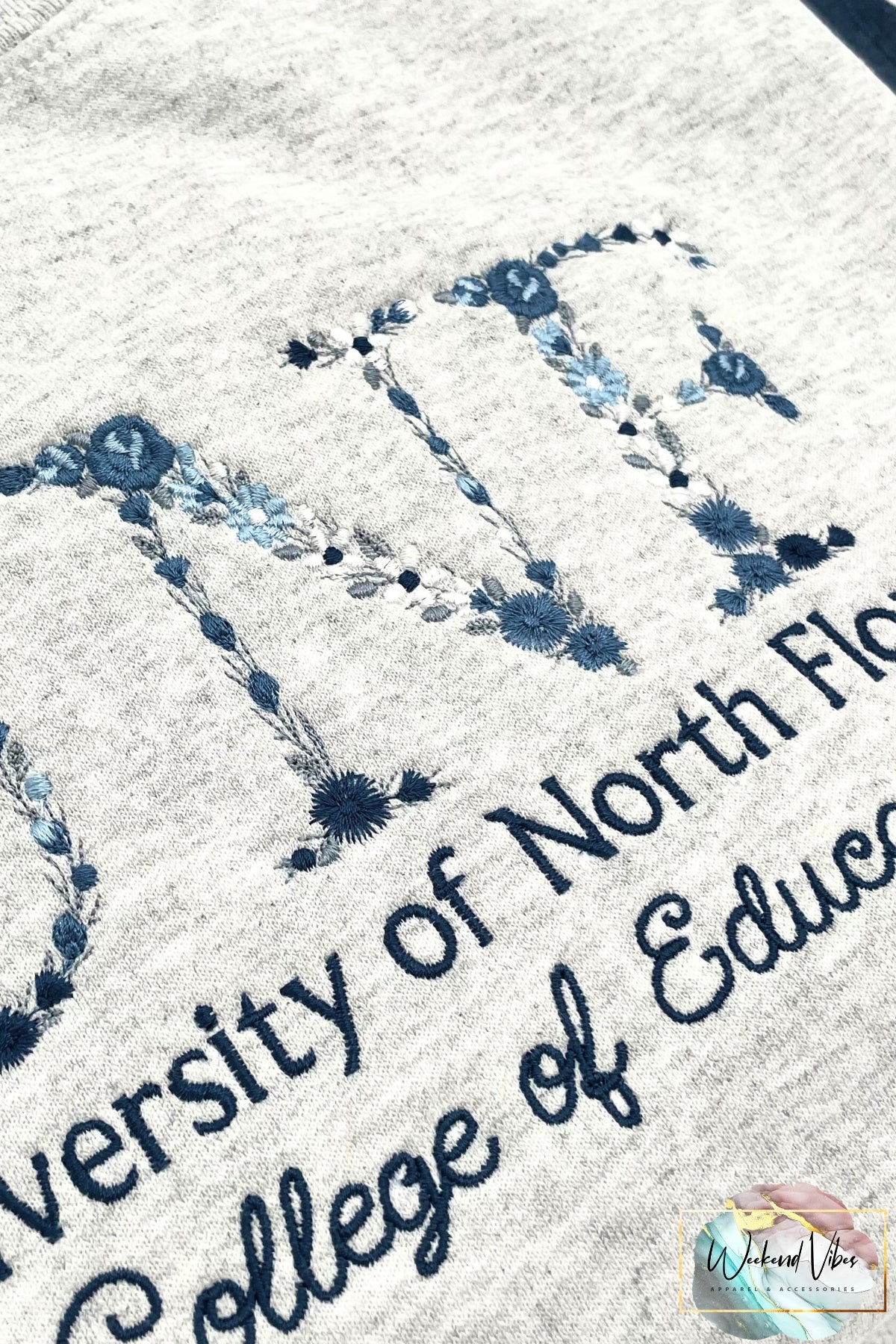Keywords: Custom University Sweatshirt, Embroidered College Sweatshirt, Graduation Gift, Women's Sweatshirt, Customizable Sweatshirt, Floral Font Embroidery, Gift for college freshmen, College Senior, High School Senior, Birthday gift for Grad, Weekend Vibes, weekendvibesapparel, weekend.