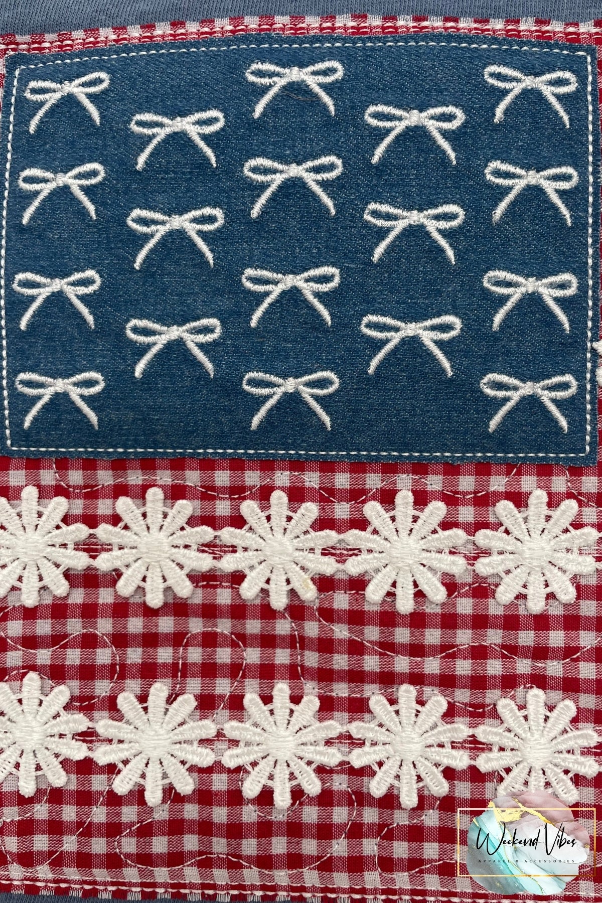 Elevate your summer style this year with our Patriotic Flag Embroidered Bow T-Shirt. This design features floral lace, embroidered ribbon bows, and a bold red-white checkered applique flag design with denim accent. Perfect for patriotic vibes and sparklers! Shop now and make a statement this 4th of July.