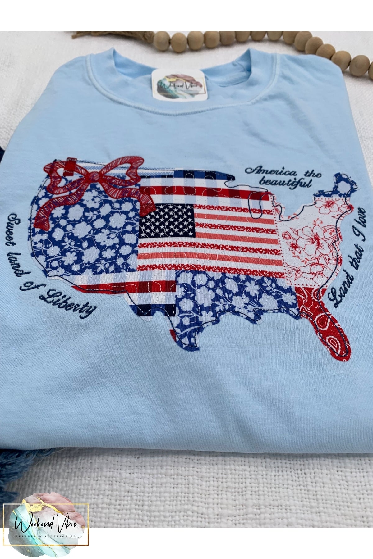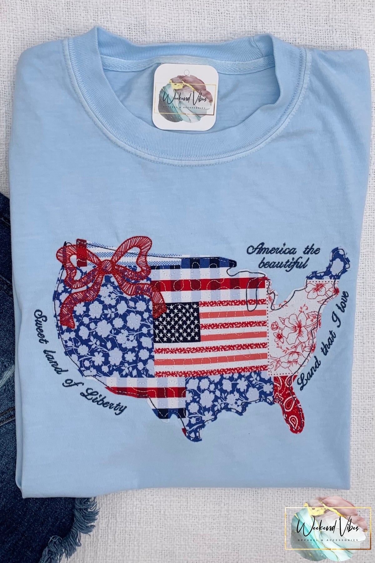 Embroidered USA Patriotic Tee, Cute 4th of July Tee, Comfort Colors Red White Blue Patchwork Applique T-shirt, USA Map T Shirt with Bow