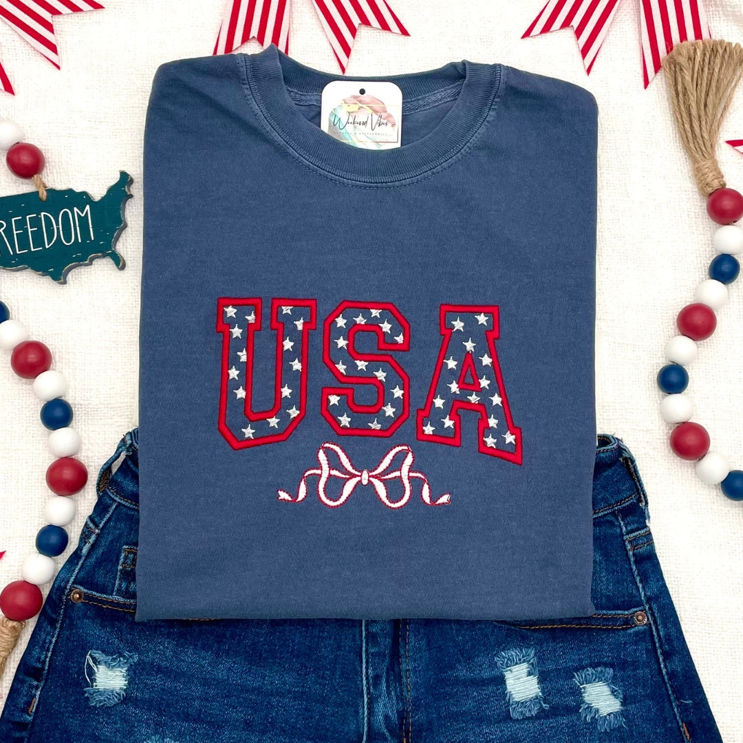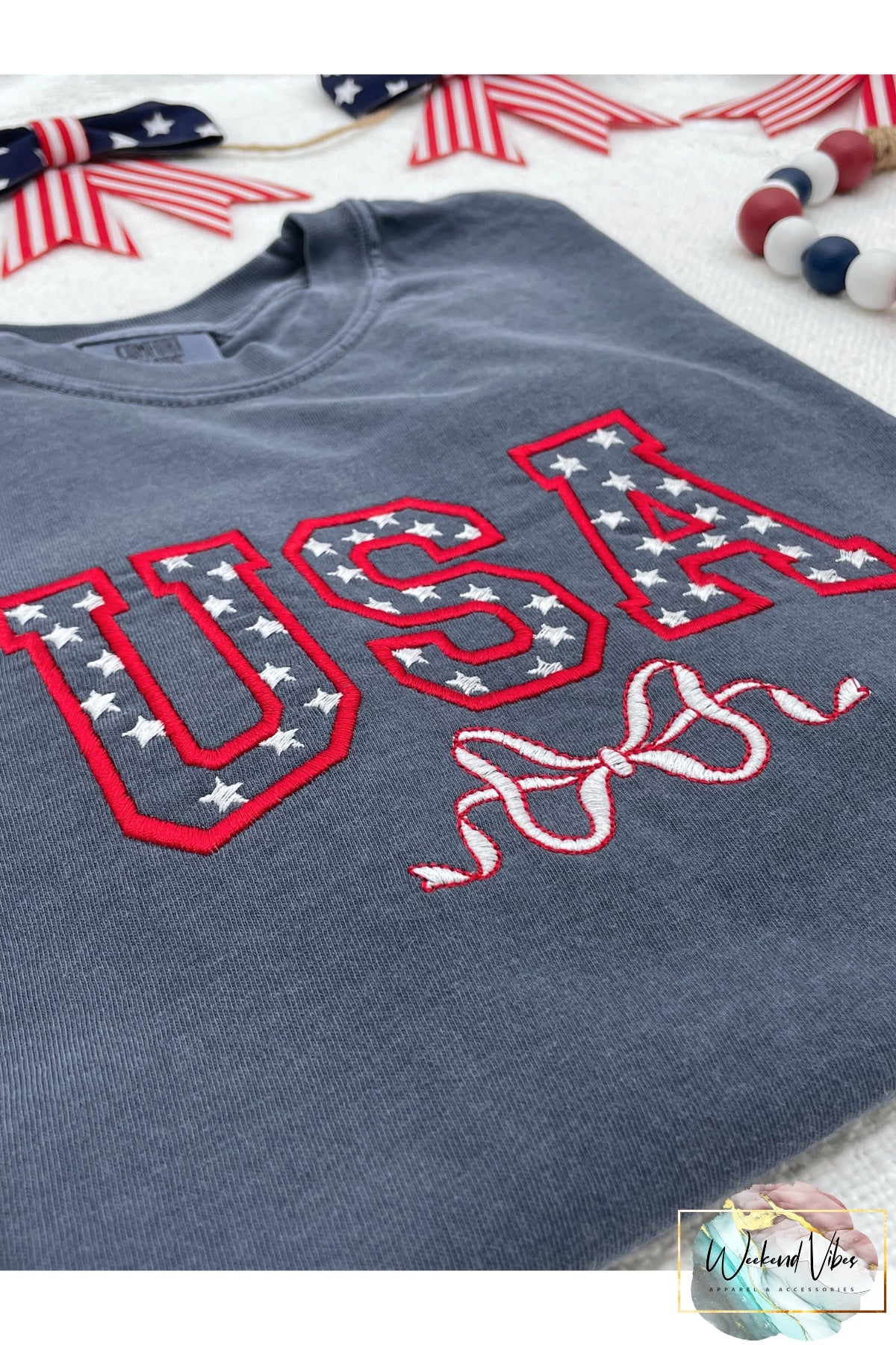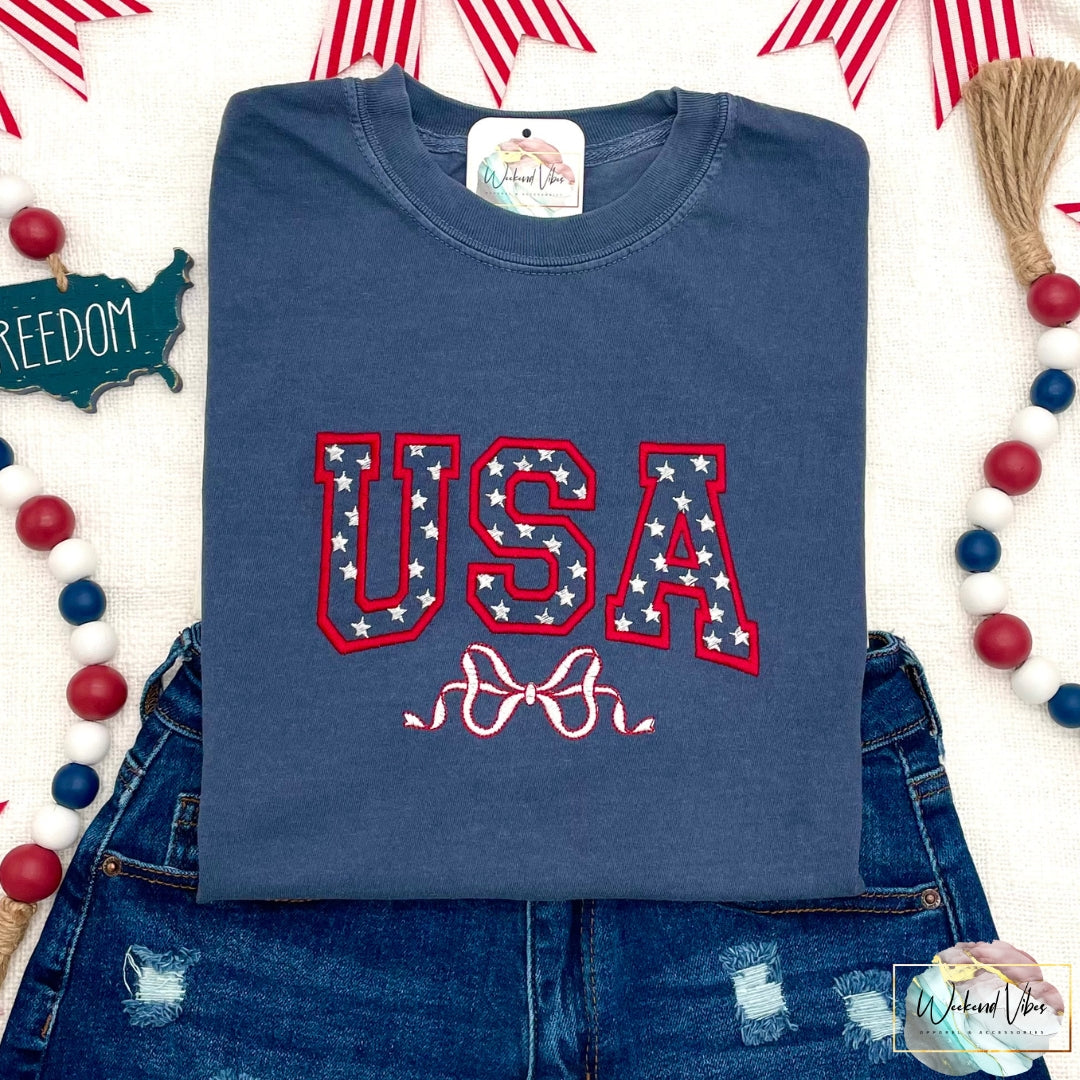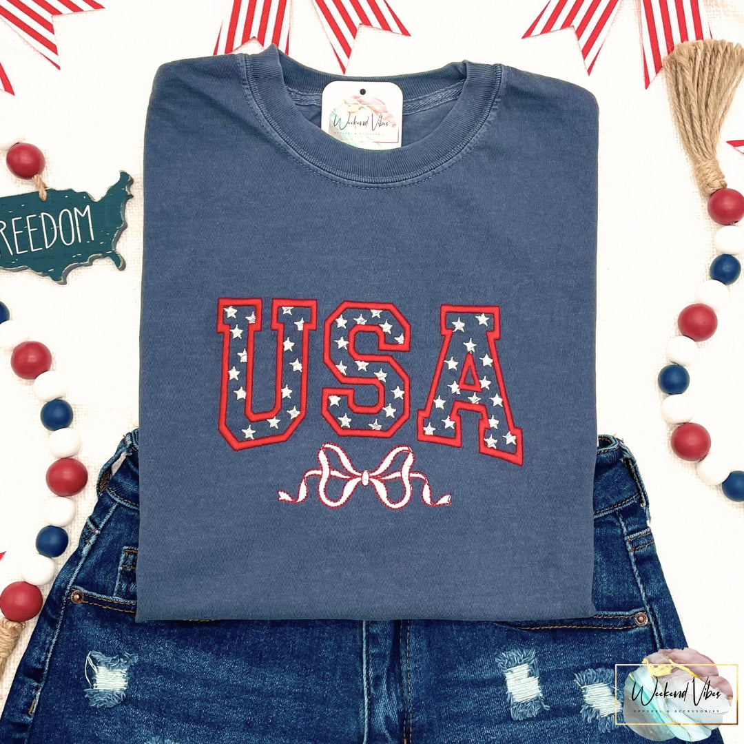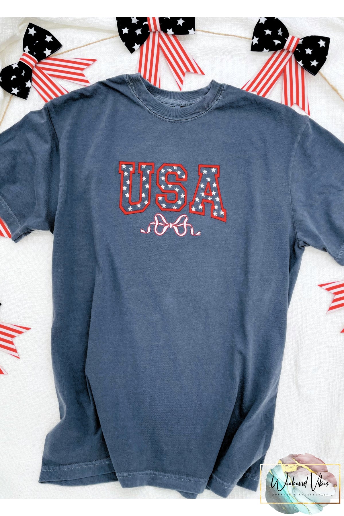 USA Stars & Coquette Bow Embroidered Patriotic Tee Shirt