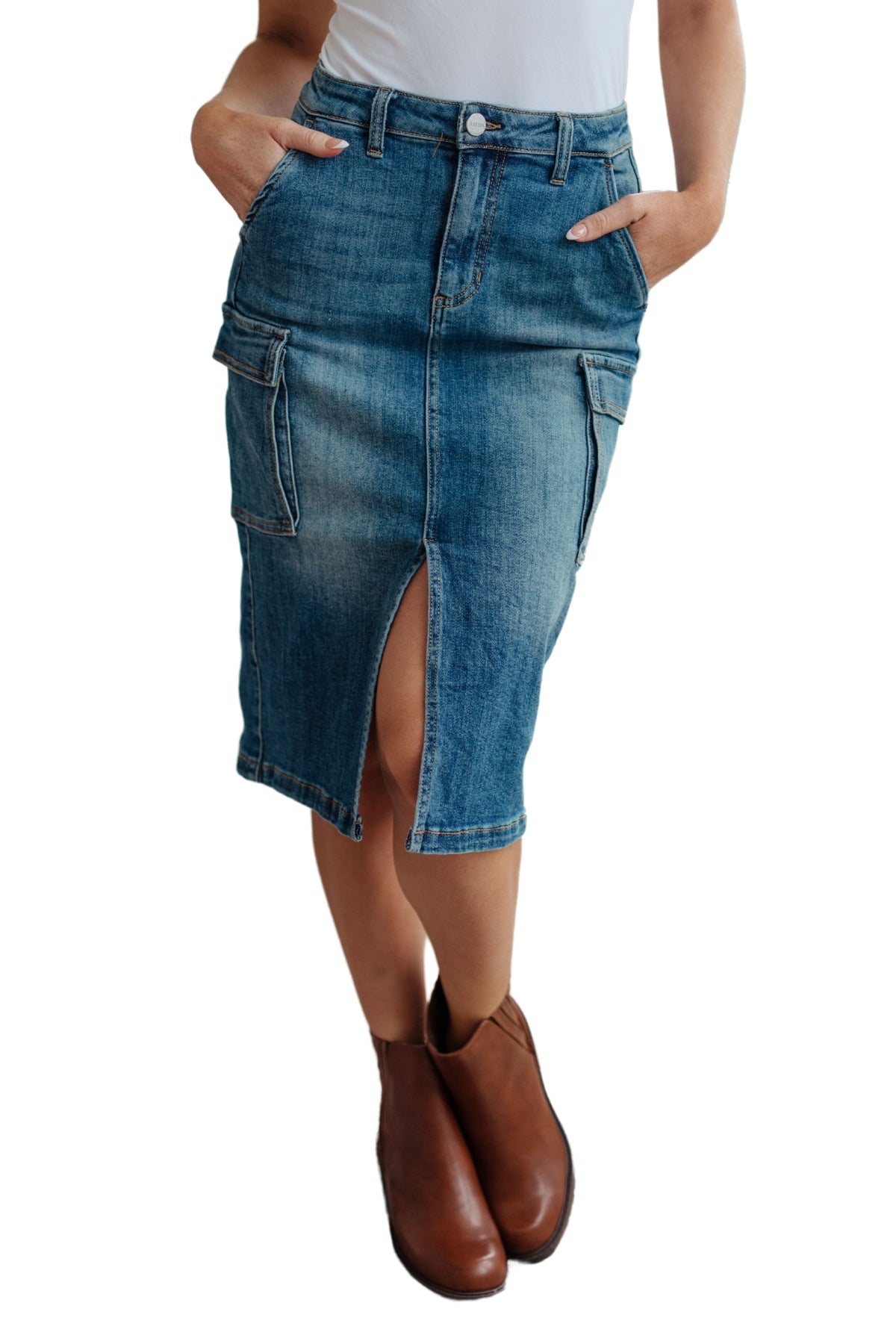 This stylish Risen Always Be There Cargo Denim Skirt is the perfect piece for everyday wear. It's crafted with stretchy medium wash denim for a comfortable fit and extra movement, and features a front slit and cargo pockets for a more dynamic look. Look great and put your most fashionable foot forward!