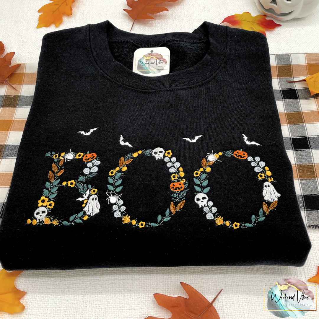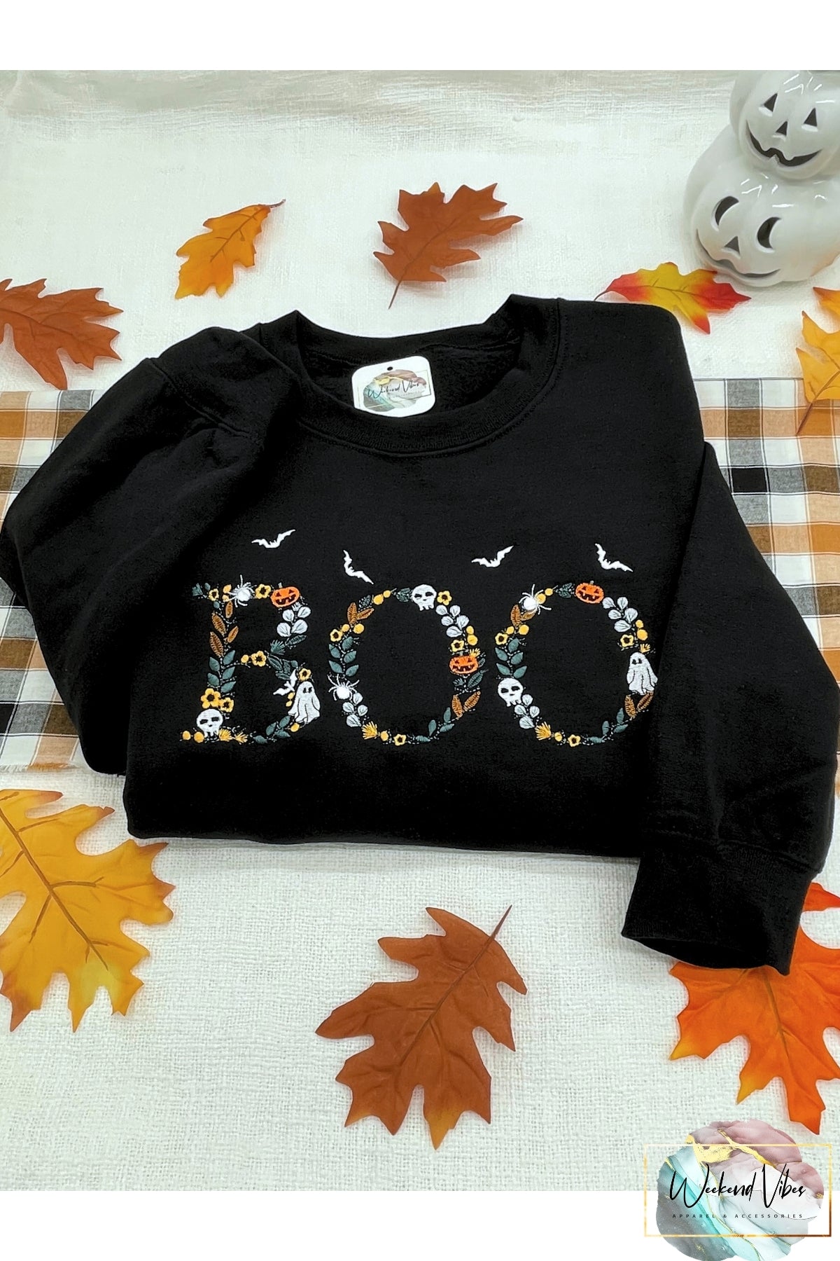 Keywords: Halloween Sweatshirt, Spooky Season, Embroidered Halloween, Cute Boo Ghost, Halloween Party Pullover, Spooky Vibes, Floral Fall Top, women's Halloween, Pumpkin Spice, trick or treat top, weekendvibesapparel.