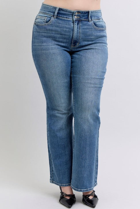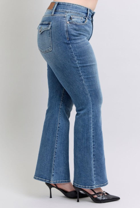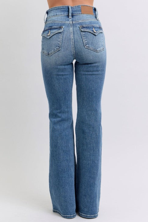 Step into the past with our Judy Blue Ariana High Rise Double Button Waistband Flare Jeans. Featuring a wide double button waistband and throwback vintage feel, these jeans will give you a flattering and comfortable fit. The flared silhouette, high rise and button closure flap back pockets make these jeans a must have style. And with non-distressed fabric and 4-way stretch, you'll look and feel your best all day long. Time to make a statement in these playful and trendy jeans!