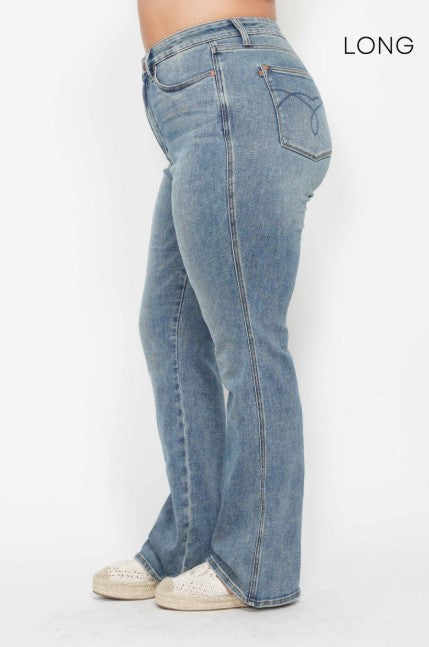 Tummy Control Back Embroidered Pocketed Bootcut Jeans are a stylish and figure-flattering option for your denim collection. The tummy control feature helps smooth and shape your midsection for a streamlined look. The embroidered pockets add a fun and trendy detail to the back of the jeans. The bootcut silhouette is classic and versatile, making these jeans a great option for a variety of occasions. Pair them with a blouse and heels for a dressier look, or with a casual tee and sneakers for a more relaxed outfit. These jeans offer both style and functionality, making them a must-have in your closet. Available in three different Inseam Lengths, see table below.