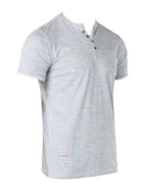 Zimego's short sleeve Henley shirt is the perfect go-to on a relaxed, casual day. This heathered blue modern Henley features platinum finished buttons (the top two are designed not to be closed) and contrasting fabric layers on the neck and sleeves in a stylish heathered gray material. Cross stitching spans across the shoulders and shirt bottom and a Zimego logo patch adorns the bottom front panel.
