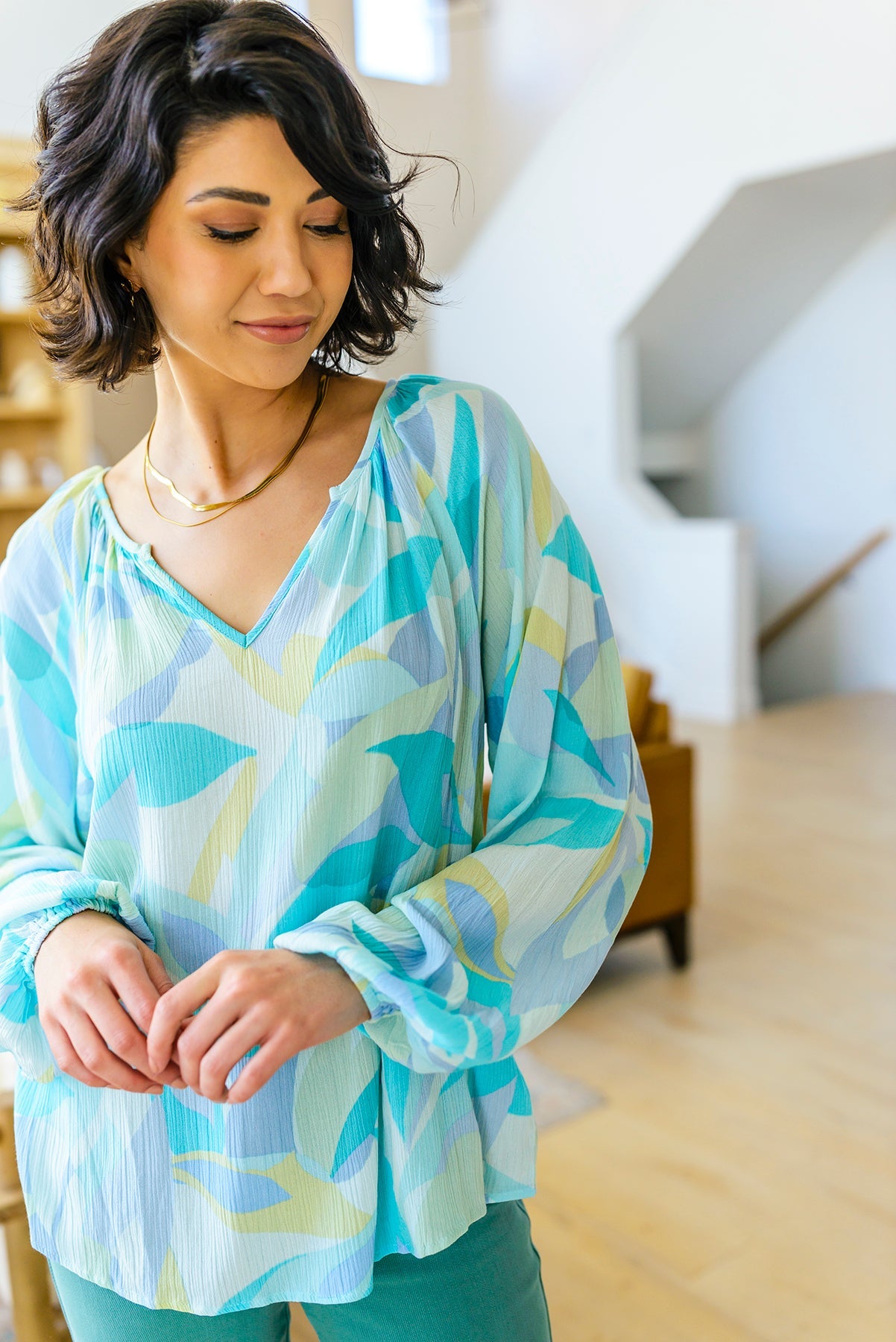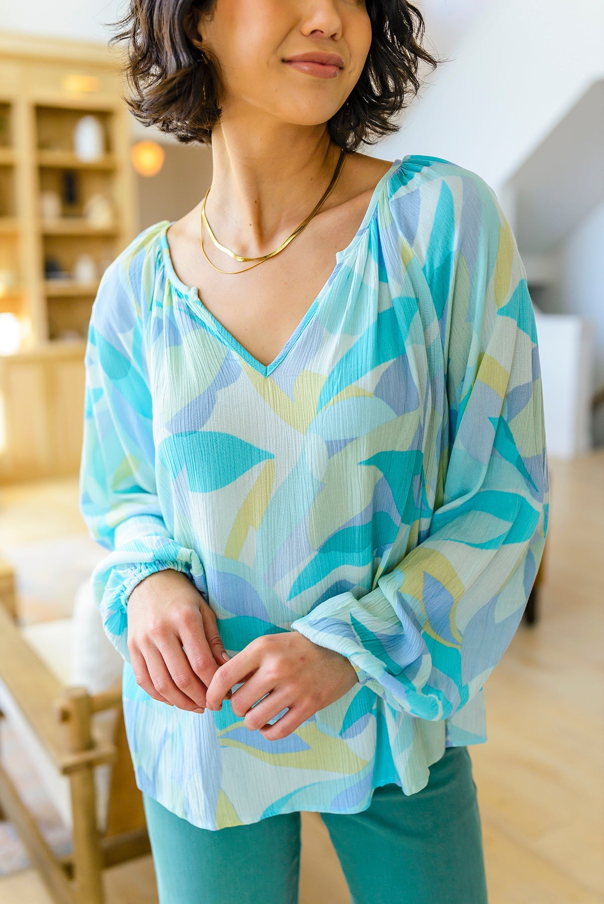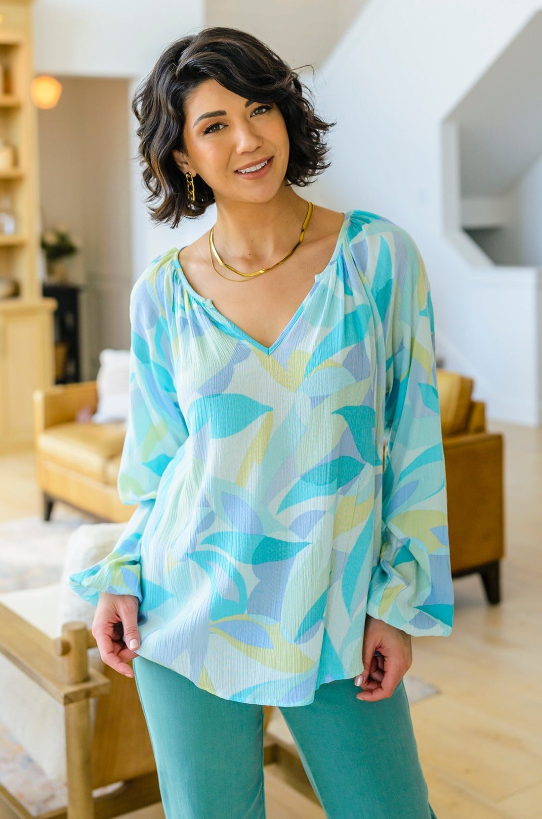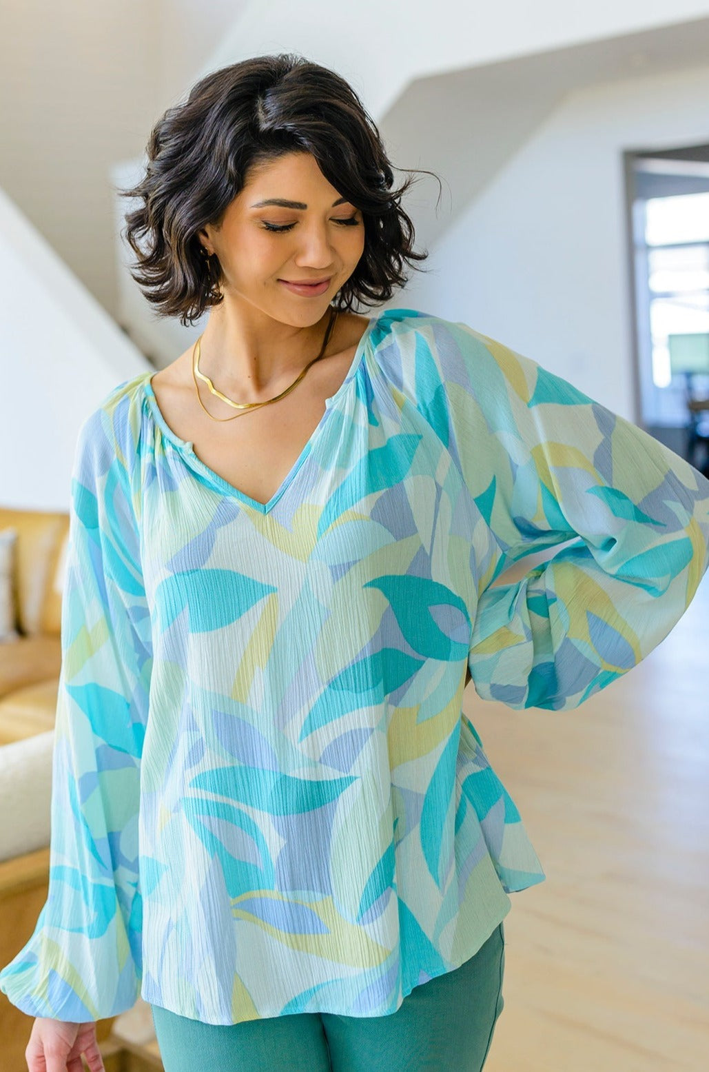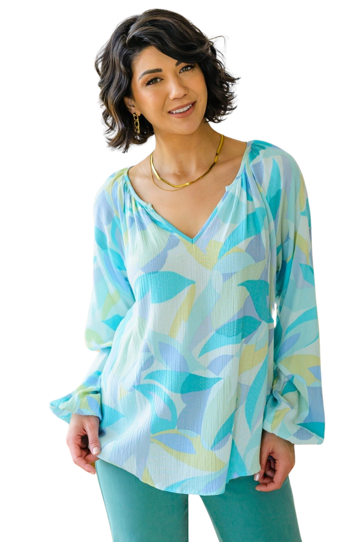 Our Emily Wonder Long Sleeve Abstract Tropical Print V-Neck Blouse is a work of art! Crafted from lightweight crinkle rayon that moves with you, it features all your favorite details like a v-neckline, raglan balloon sleeves, and a pleasing abstract leaf design in soft cyan blues and greens.