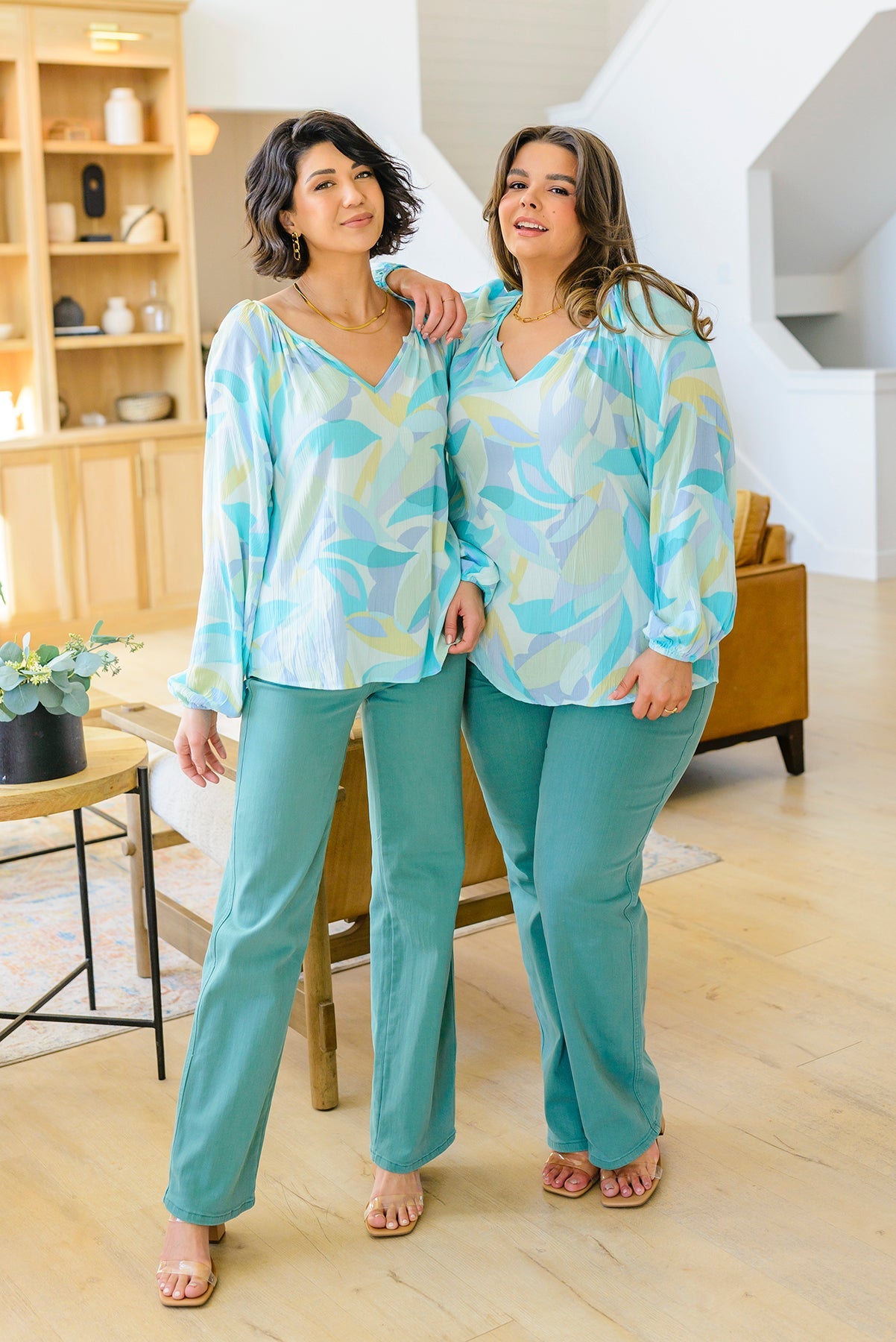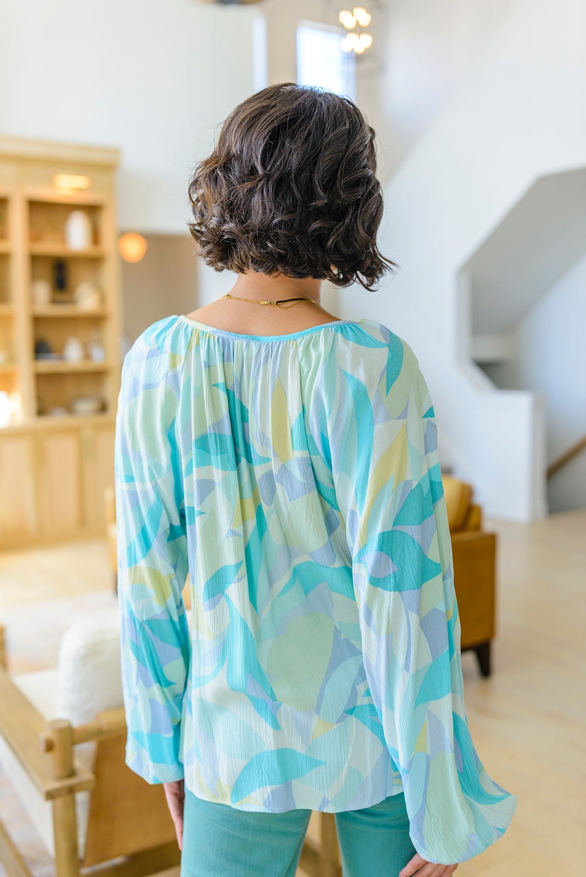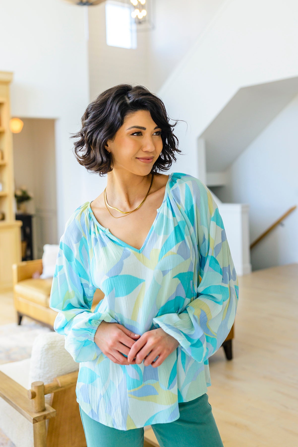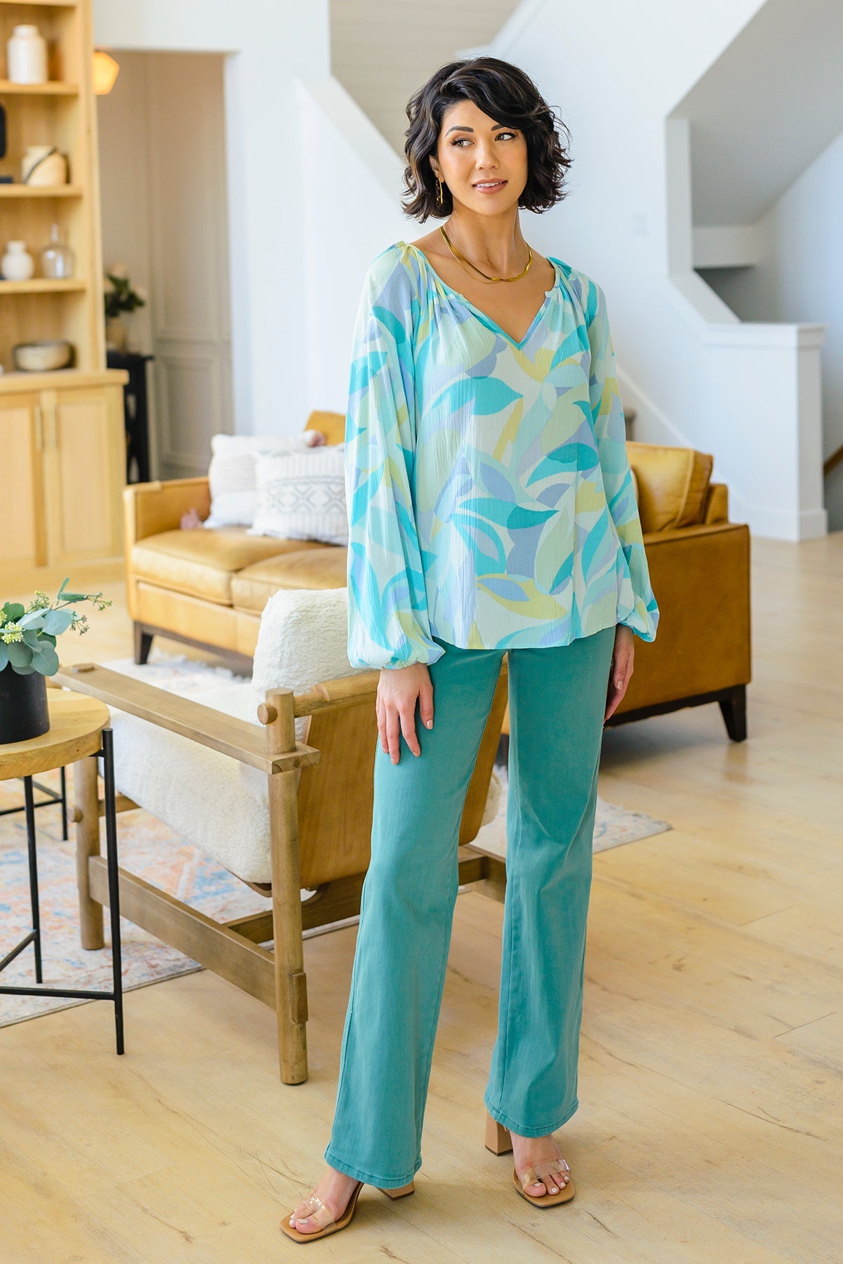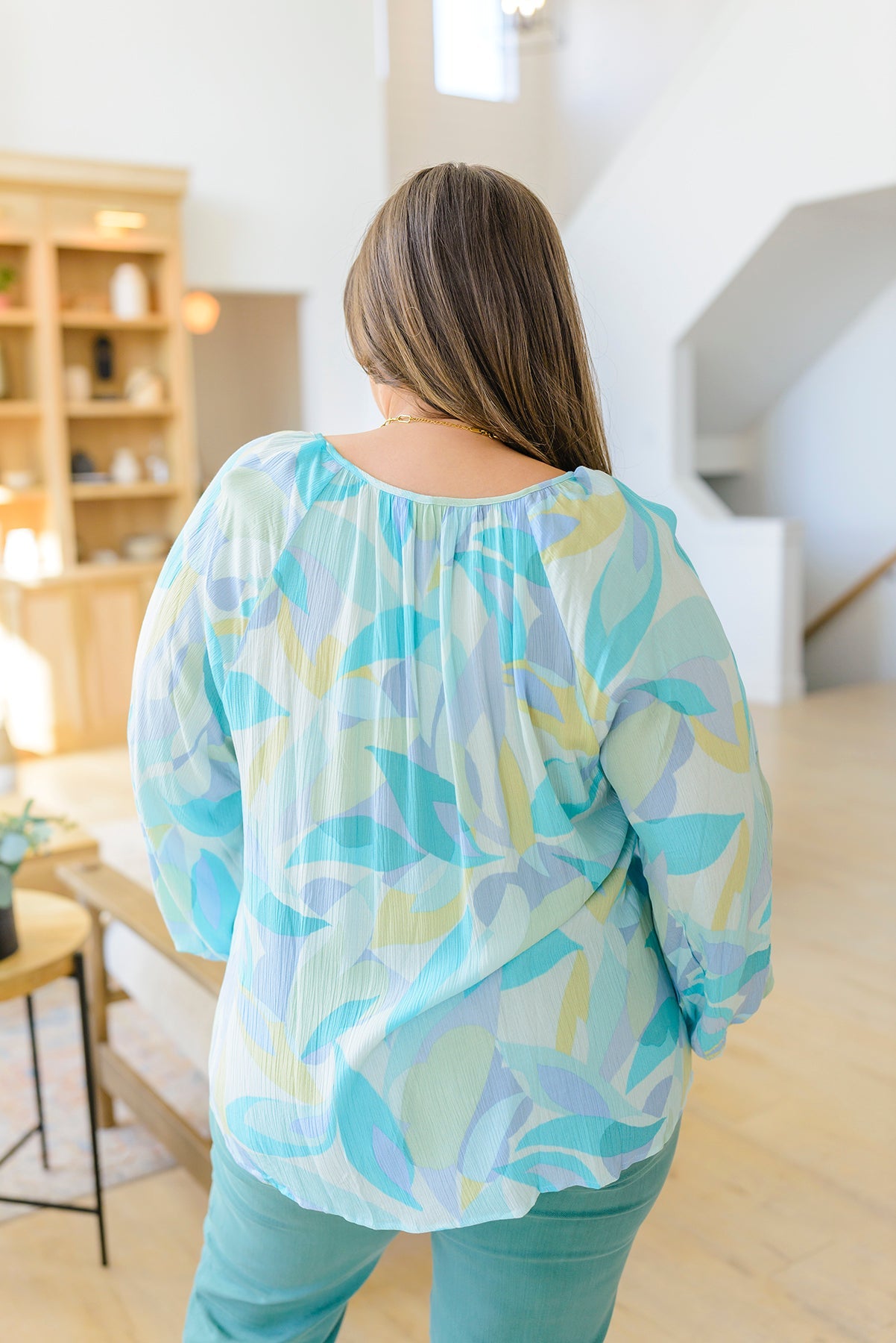 Our Emily Wonder Long Sleeve Abstract Tropical Print V-Neck Blouse is a work of art! Crafted from lightweight crinkle rayon that moves with you, it features all your favorite details like a v-neckline, raglan balloon sleeves, and a pleasing abstract leaf design in soft cyan blues and greens.
