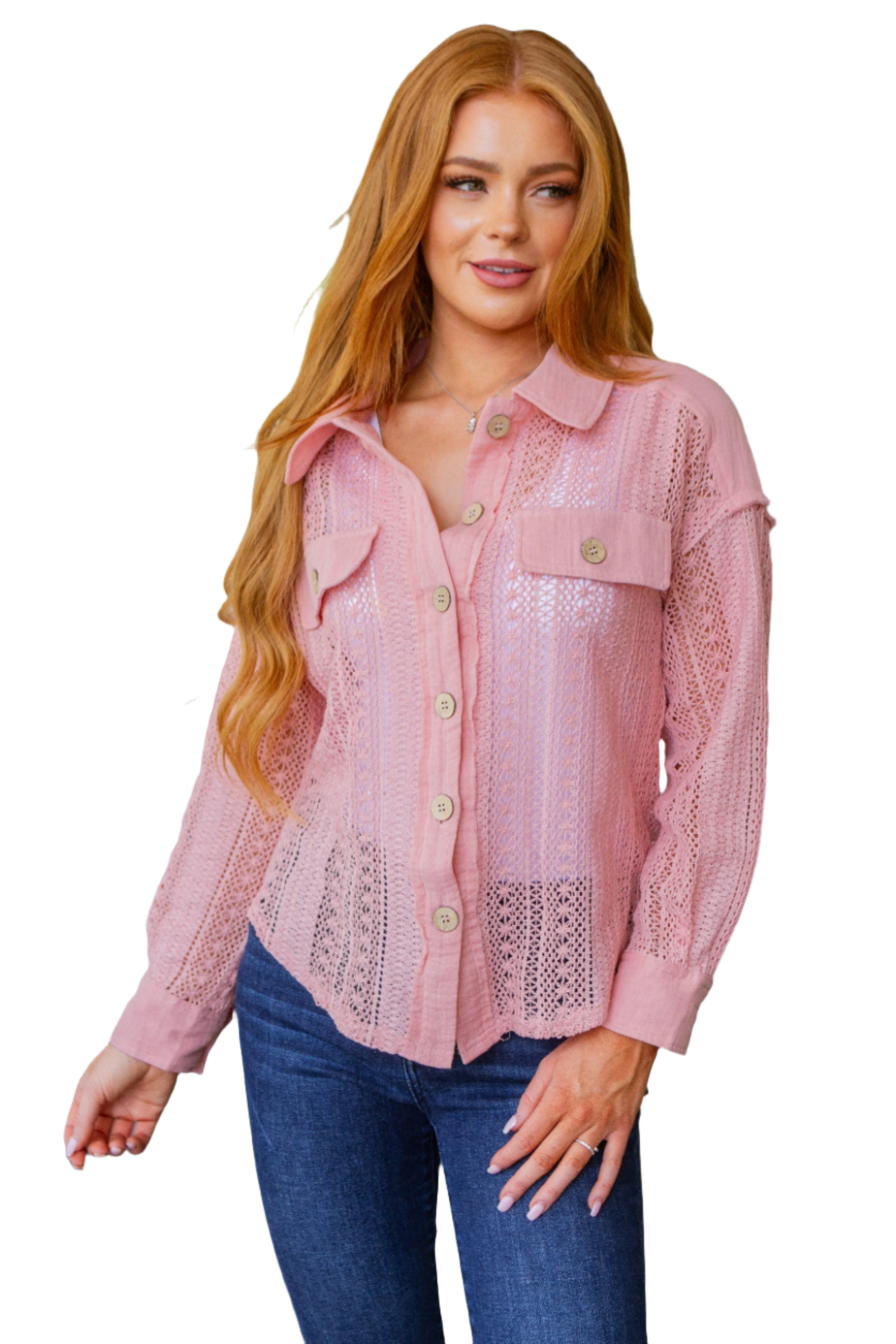 Experience our exquisite Sweeter Than Nectar Lace Button Down in Rose Pink. Crafted with delicate sheer lace, this button down is designed with your comfort in mind, featuring long sleeves, it can easily be layered over your favorite tank or bralette. Make a statement today and embrace effortless fashion!