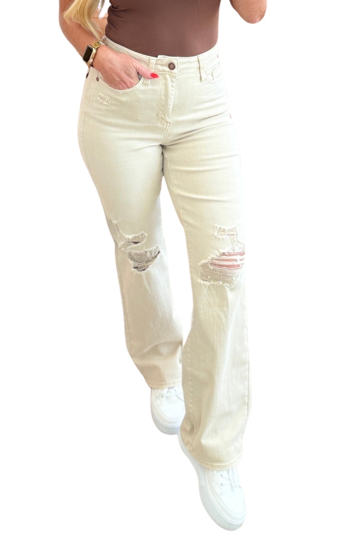 Selena High Rise Distressed 90's Straight Jeans in Bone by Judy Blue