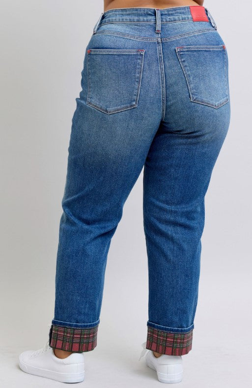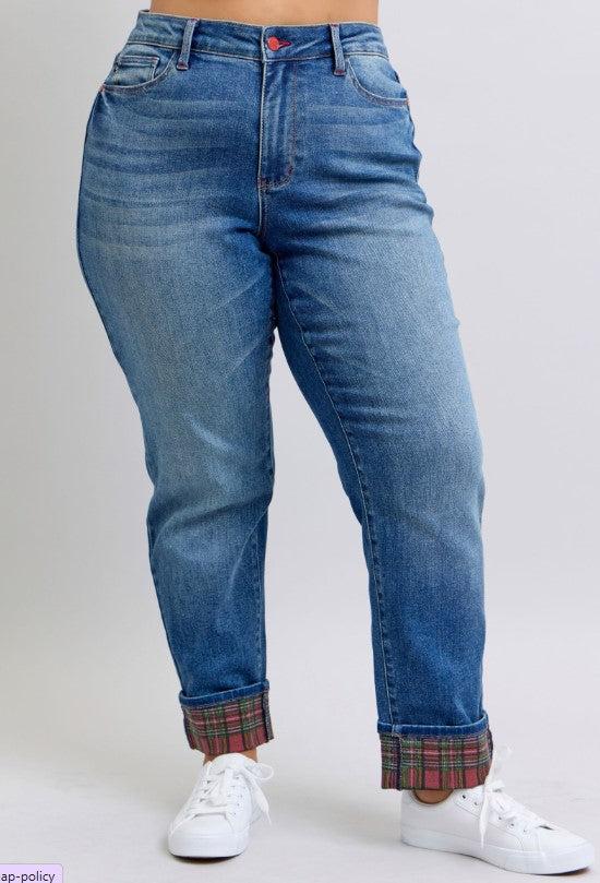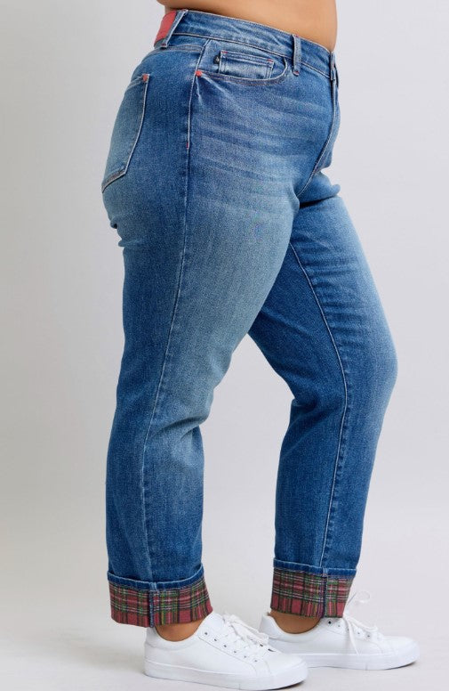 Judy Blue Plaid Print Cuff Straight Leg Jeans with Pockets in Medium Wash