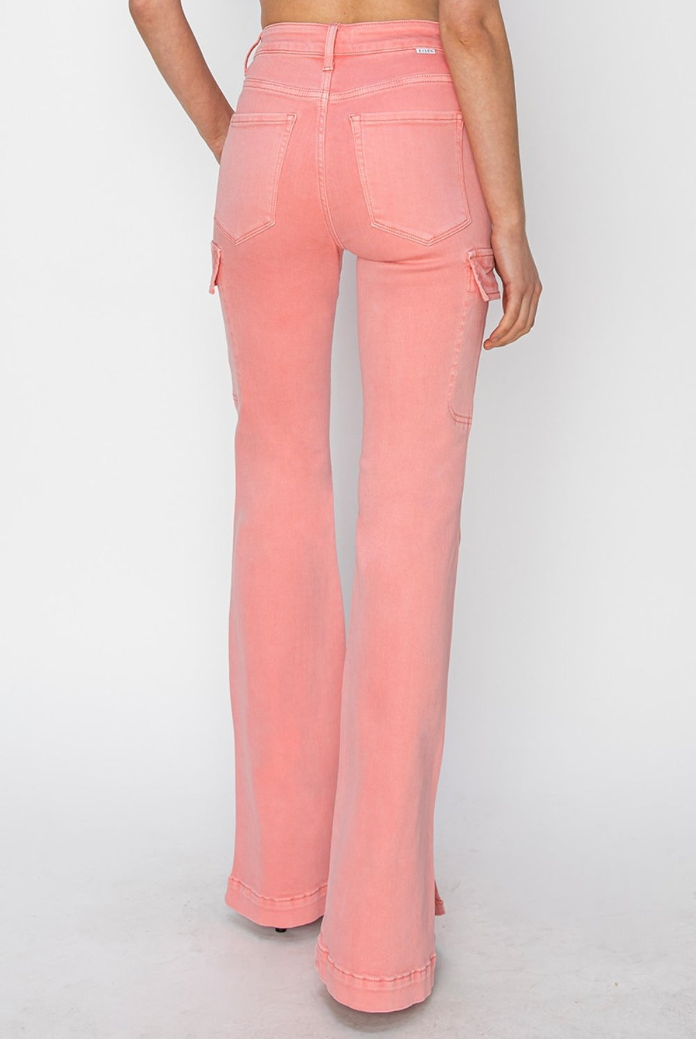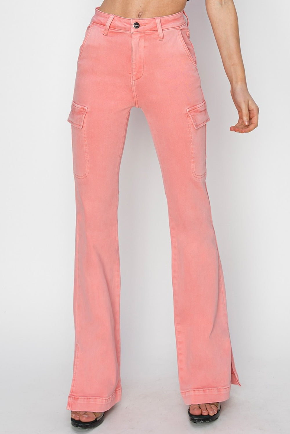 RISEN High Rise Side Slit Cargo Bootcut Jeans in Flamingo Pink