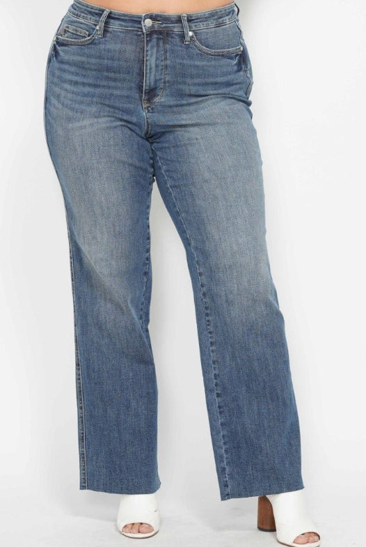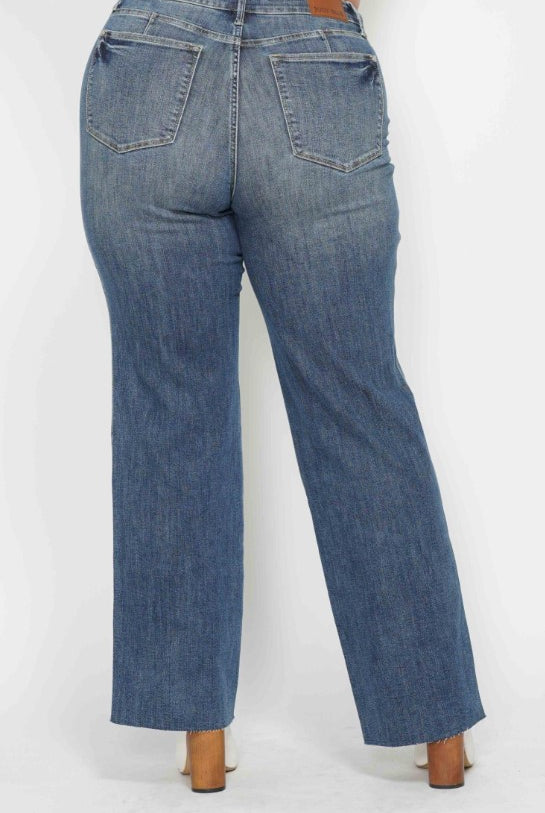 Judy Blue Tummy Control Cut Raw Hem Straight Jeans in Medium Wash