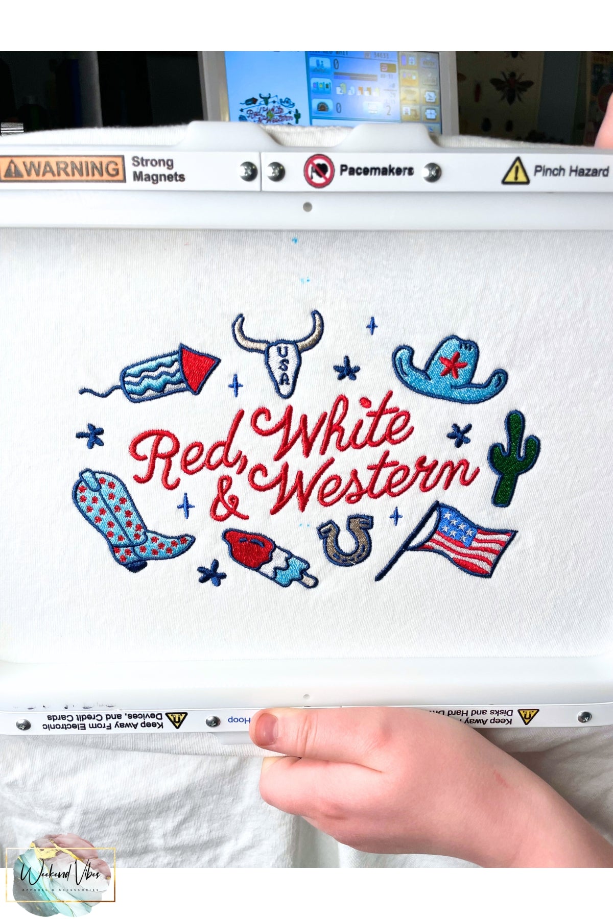 Our Red, White, and Western Patriotic Embroidered T-shirt will be your go to shirt this summer for any concert, country fair, or when you are just lounging during a weekend barbeque. This fully embroidered design is available in sixteen different colors on 100% cotton Comfort Colors colorwashed t-shirts.