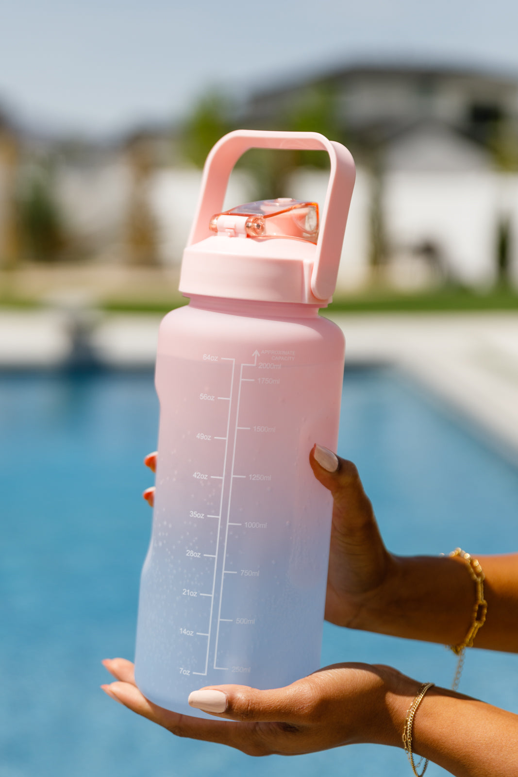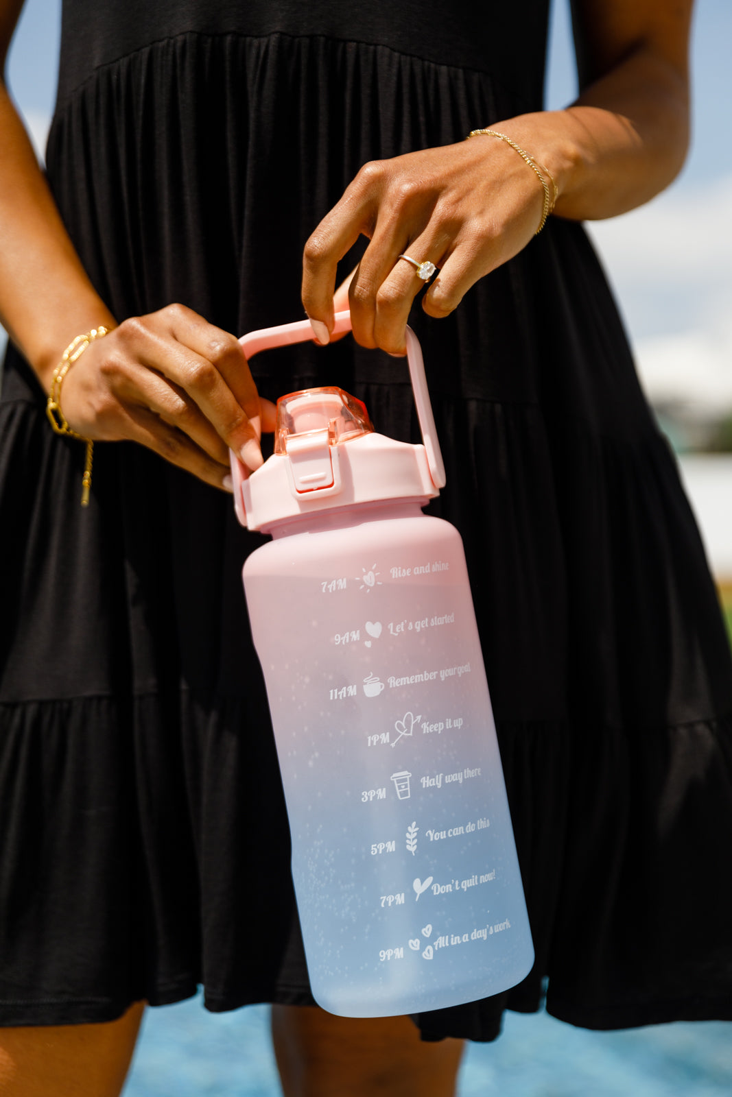 The Happy Hydrations Water Bottle - the bottle that makes hydrating as easy as sipping piña coladas on a sunny beach! This bottle is more than just a pretty face - it comes in beautiful ombre colors that will have all your friends ooh-ing and ahh-ing with envy. And not only that, but it also features motivational reminders by measurement marks to remind you to drink your water, so you can stay healthy and glowing like a summer goddess! With a convenient pop-up cap and a sturdy carrying handle, the Happy Hydrations Water Bottle is the perfect on-the-go companion for anyone who wants to stay hydrated and happy.