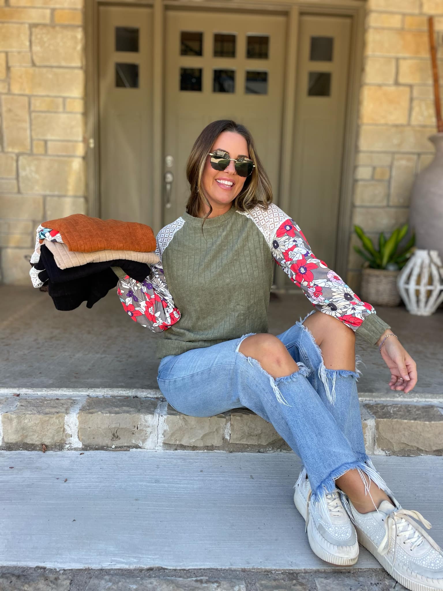 Available in four perfectly seasonal colors, this wide ribbed blouse features a raglan sleeve with lace and floral accents. Easy to transition from the office to the weekend!