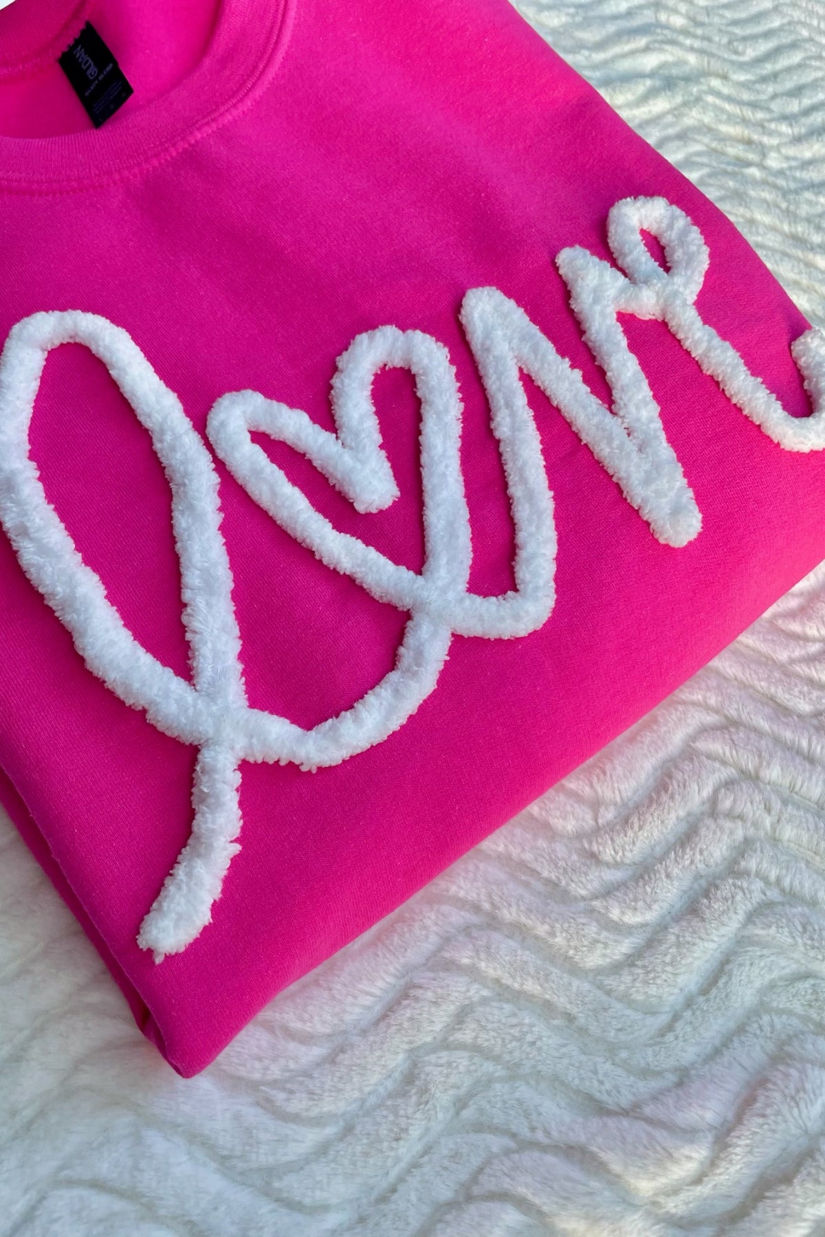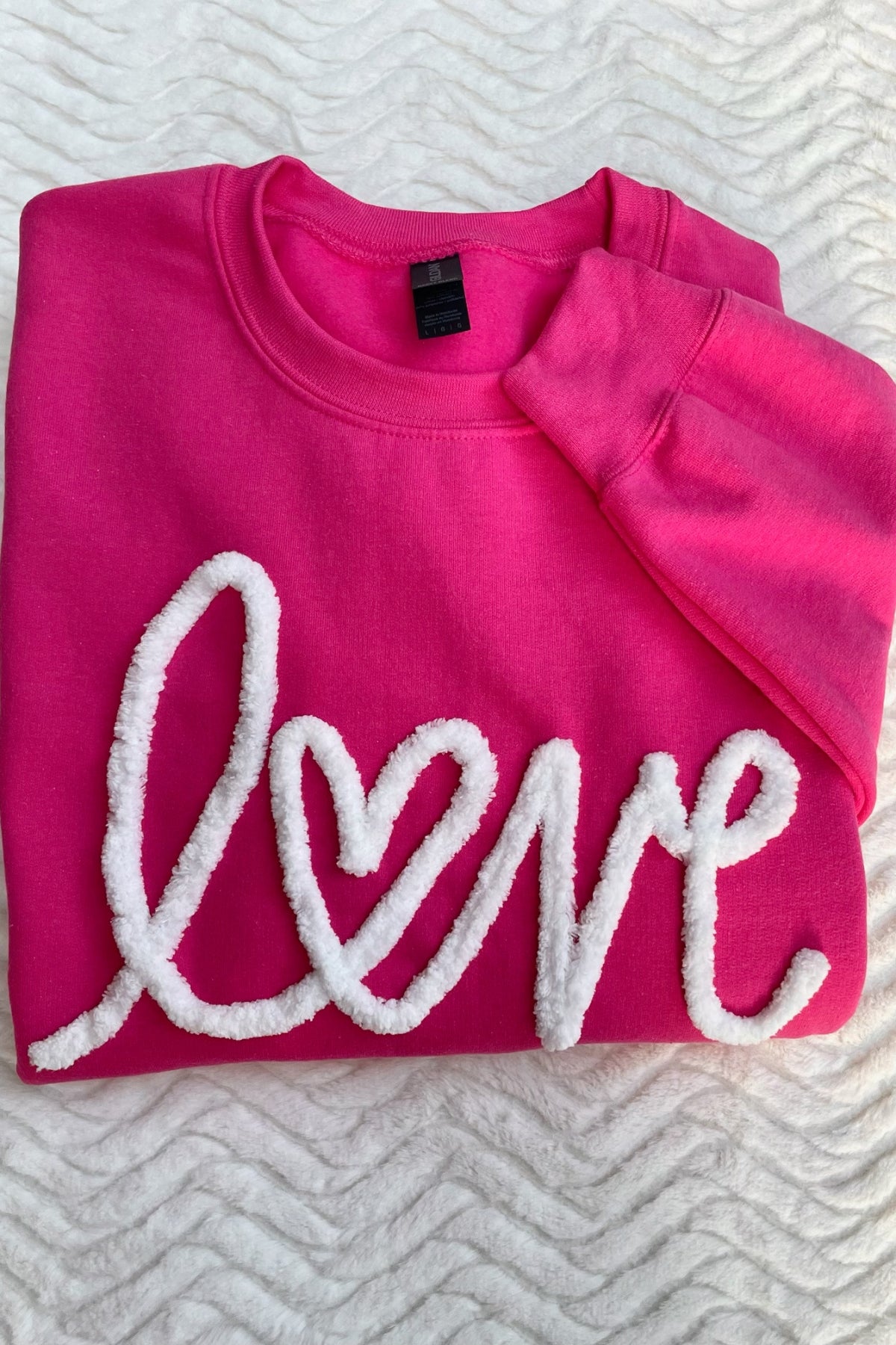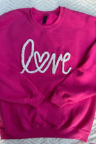 We are obsessed with this trending Valentine's Day sweatshirt design with the word Love embroidered in large, chenille yarn font. The soft chenille yarn and Gildan sweatshirt colors provide a vibrant look that perfectly blends style and comfort!